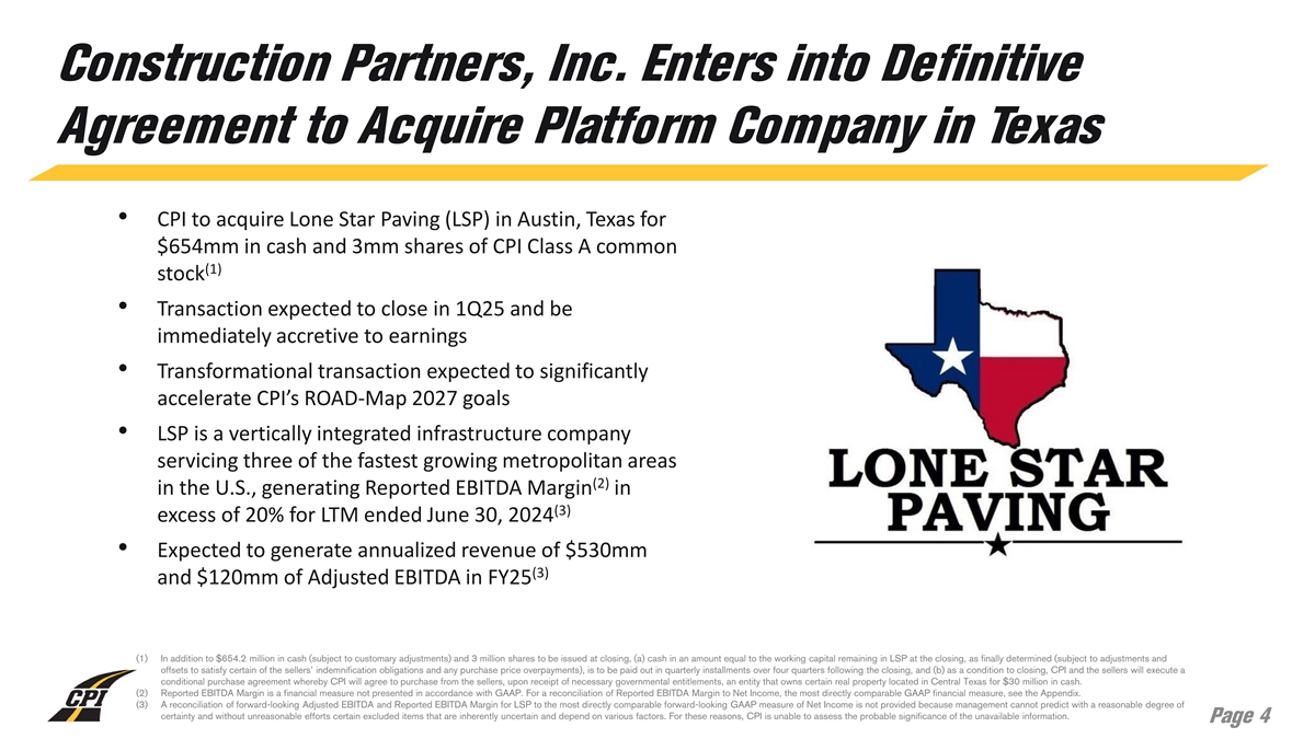 Cautionary Statements (cont’d) Use of Non-GAAP Financial Information The Company presents Adjusted EBITDA and Adjusted EBTIDA Margin to help the Company describe its operating and financial performance. These financial measures do not conform to accounting principles generally accepted in the United States (“GAAP”), are commonly used in the Company’s industry and have certain limitations and should not be construed as alternatives to net income and other income data measures (as determined in accordance with GAAP), or as better indicators of operating performance. These non-GAAP financial measures, as defined by the Company, may not be comparable to similar non-GAAP financial measures presented by other companies. The Company’s presentation of such measures should not be construed as an inference that its future results will be unaffected by unusual or non-recurring items. For additional information regarding the Company’s use of non-GAAP financial information, as well as reconciliations of non-GAAP financial measures to the most directly comparable financial measures calculated and presented in accordance with GAAP, please see the appendix to this presentation. Asphalt Inc., LLC d/b/a Lone Star Paving The information and data relating to LSP contained in this presentation is based on information provided by LSP that we believe is accurate, but we have not independently verified such information. This data is subject to change and may not be reliable. Combined Results The financial information included in this presentation is not intended to comply with the requirements of Regulation S-X under the Securities Act and the rules and regulations of the SEC promulgated thereunder, in particular with respect to the presentation of any pro forma financial information. As a result, the information that the Company files with the SEC at a later date may differ from the information contained in this presentation in order to comply with SEC rules. The combined results contained herein have been prepared by the Company’s management solely based on adding the historical financial statements of the Company and LSP for the applicable periods and have not been prepared or reviewed by any independent accounting firm. The combined results contained herein do not purport to contain all of the information that a prospective investor may desire in evaluating the proposed acquisition of LSP and/or the related transactions. Industry and Market Data This presentation contains statistical and market data that the Company obtained from industry publications, reports generated by third parties, third-party studies, and public filings. Although the Company believes that the publications, reports, studies, and filings are reliable as of the date of this presentation, the Company has not independently verified such statistical or market data. The industry in which the Company operates is subject to a high degree of uncertainty and risk due to a variety of factors. These and other factors could cause results to differ materially from those expressed in these publications and reports. Page 3