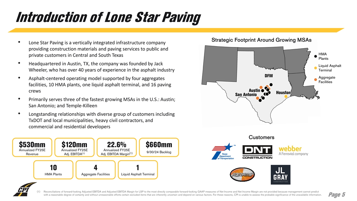 Construction Partners, Inc. Enters into Definitive Agreement to Acquire Platform Company in Texas • CPI to acquire Lone Star Paving (LSP) in Austin, Texas for $654mm in cash and 3mm shares of CPI Class A common (1) stock • Transaction expected to close in 1Q25 and be immediately accretive to earnings • Transformational transaction expected to significantly accelerate CPI’s ROAD-Map 2027 goals • LSP is a vertically integrated infrastructure company servicing three of the fastest growing metropolitan areas (2) in the U.S., generating Reported EBITDA Margin in (3) excess of 20% for LTM ended June 30, 2024 • Expected to generate annualized revenue of $530mm (3) and $120mm of Adjusted EBITDA in FY25 (1) In addition to $654.2 million in cash (subject to customary adjustments) and 3 million shares to be issued at closing, (a) cash in an amount equal to the working capital remaining in LSP at the closing, as finally determined (subject to adjustments and offsets to satisfy certain of the sellers’ indemnification obligations and any purchase price overpayments), is to be paid out in quarterly installments over four quarters following the closing, and (b) as a condition to closing, CPI and the sellers will execute a conditional purchase agreement whereby CPI will agree to purchase from the sellers, upon receipt of necessary governmental entitlements, an entity that owns certain real property located in Central Texas for $30 million in cash. (2) Reported EBITDA Margin is a financial measure not presented in accordance with GAAP. For a reconciliation of Reported EBITDA Margin to Net Income, the most directly comparable GAAP financial measure, see the Appendix. (3) A reconciliation of forward-looking Adjusted EBITDA and Reported EBITDA Margin for LSP to the most directly comparable forward-looking GAAP measure of Net Income is not provided because management cannot predict with a reasonable degree of certainty and without unreasonable efforts certain excluded items that are inherently uncertain and depend on various factors. For these reasons, CPI is unable to assess the probable significance of the unavailable information. Page 4