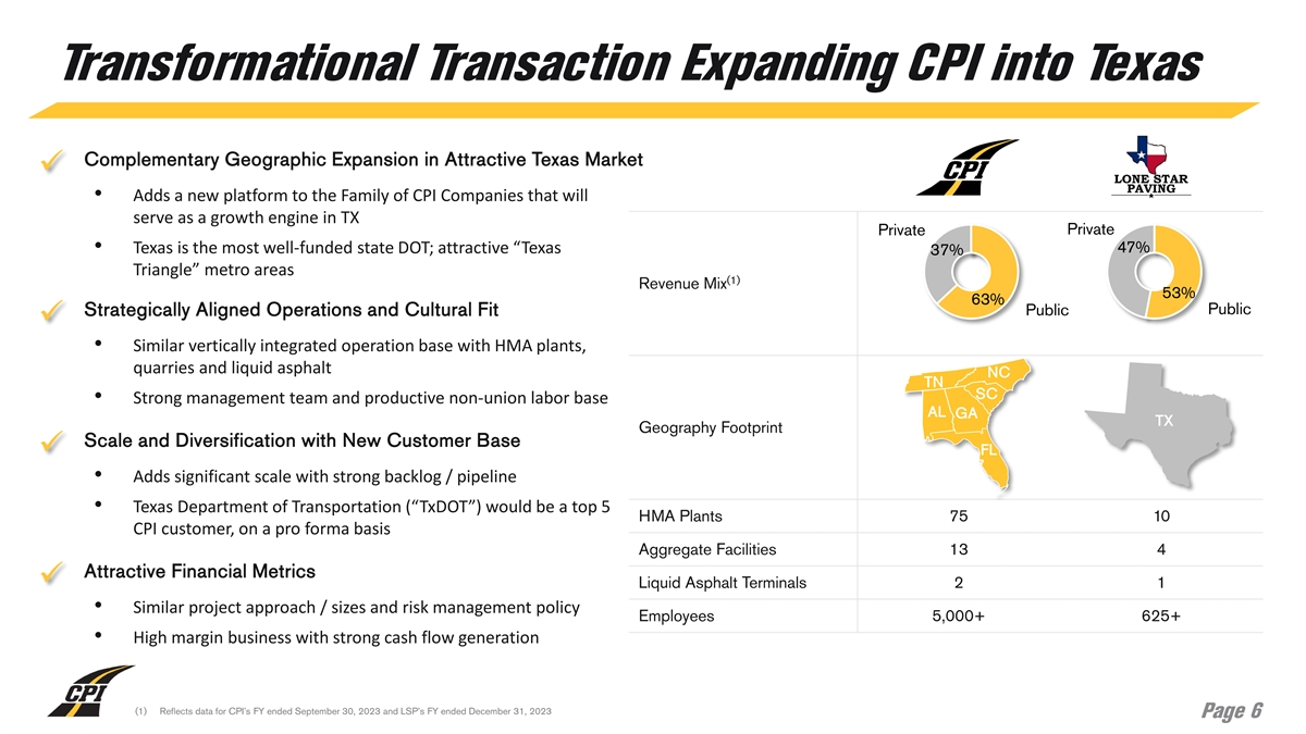 Introduction of Lone Star Paving Strategic Footprint Around Growing MSAs • Lone Star Paving is a vertically integrated infrastructure company providing construction materials and paving services to public and HMA private customers in Central and South Texas Plants • Headquartered in Austin, TX, the company was founded by Jack Liquid Asphalt Wheeler, who has over 40 years of experience in the asphalt industry Terminal DFW Aggregate • Asphalt-centered operating model supported by four aggregates Facilities facilities, 10 HMA plants, one liquid asphalt terminal, and 16 paving Austin crews Houston San Antonio • Primarily serves three of the fastest growing MSAs in the U.S.: Austin; San Antonio; and Temple-Killeen • Longstanding relationships with diverse group of customers including TxDOT and local municipalities, heavy civil contractors, and commercial and residential developers Customers $530mm $120mm 22.6% $660mm Annualized FY25E Annualized FY25E Annualized FY25E 9/30/24 Backlog (1) (1) Revenue Adj. EBITDA Adj. EBITDA Margin 10 4 1 HMA Plants Aggregate Facilities Liquid Asphalt Terminal (1) Reconciliations of forward-looking Adjusted EBITDA and Adjusted EBITDA Margin for LSP to the most directly comparable forward-looking GAAP measures of Net Income and Net Income Margin are not provided because management cannot predict with a reasonable degree of certainty and without unreasonable efforts certain excluded items that are inherently uncertain and depend on various factors. For these reasons, CPI is unable to assess the probable significance of the unavailable information. Page 5