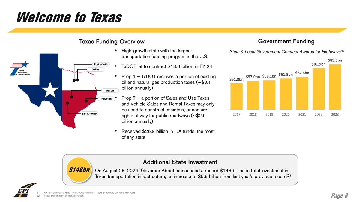 Welcome to Texas Texas Funding Overview Government Funding (1) • High-growth state with the largest State & Local Government Contract Awards for Highways transportation funding program in the U.S. $89.5bn $81.9bn • TxDOT let to contract $13.6 billion in FY 24 $64.6bn $61.5bn $58.1bn • Prop 1 – TxDOT receives a portion of existing $57.0bn $51.8bn oil and natural gas production taxes (~$3.1 billion annually) • Prop 7 – a portion of Sales and Use Taxes and Vehicle Sales and Rental Taxes may only be used to construct, maintain, or acquire 2017 2018 2019 2020 2021 2022 2023 rights of way for public roadways (~$2.5 billion annually) • Received $26.9 billion in IIJA funds, the most of any state Additional State Investment $148bn On August 26, 2024, Governor Abbott announced a record $148 billion in total investment in (2) Texas transportation infrastructure, an increase of $5.6 billion from last year’s previous record (1) ARTBA analysis of data from Dodge Analytics. Years presented are calendar years. (2) Texas Department of Transportation Page 8