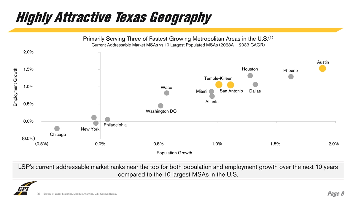 Highly Attractive Texas Geography (1) Primarily Serving Three of Fastest Growing Metropolitan Areas in the U.S. Current Addressable Market MSAs vs 10 Largest Populated MSAs (2023A – 2033 CAGR) 2.0% Austin Houston 1.5% Phoenix Temple-Killeen 1.0% Waco Miami San Antonio Dallas Atlanta 0.5% Washington DC 0.0% Philadelphia New York Chicago (0.5%) (0.5%) 0.0% 0.5% 1.0% 1.5% 2.0% Population Growth LSP’s current addressable market ranks near the top for both population and employment growth over the next 10 years compared to the 10 largest MSAs in the U.S. (1) Bureau of Labor Statistics, Moody’s Analytics, U.S. Census Bureau Page 9 Employment Growth