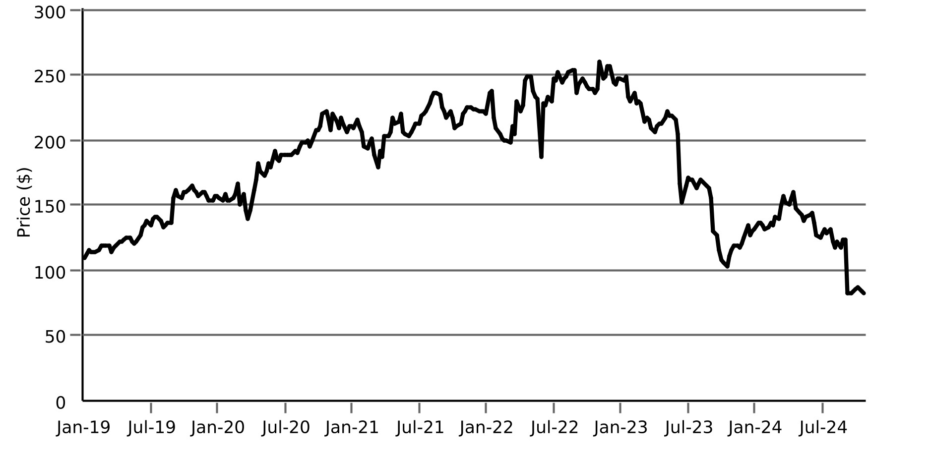 The following graph sets forth the historical performance of the Reference Stock based on the weekly historical closing prices of one share of the Reference Stock from January 4, 2019 through October 11, 2024. The closing price of one share of the Reference Stock on October 17, 2024 was $81.90. We obtained the closing prices above and below from the Bloomberg Professional® service (“Bloomberg”), without independent verification. The closing prices above and below may have been adjusted by Bloomberg for corporate actions, such as stock splits, public offerings, mergers and acquisitions, spin-offs, delistings and bankruptcy.