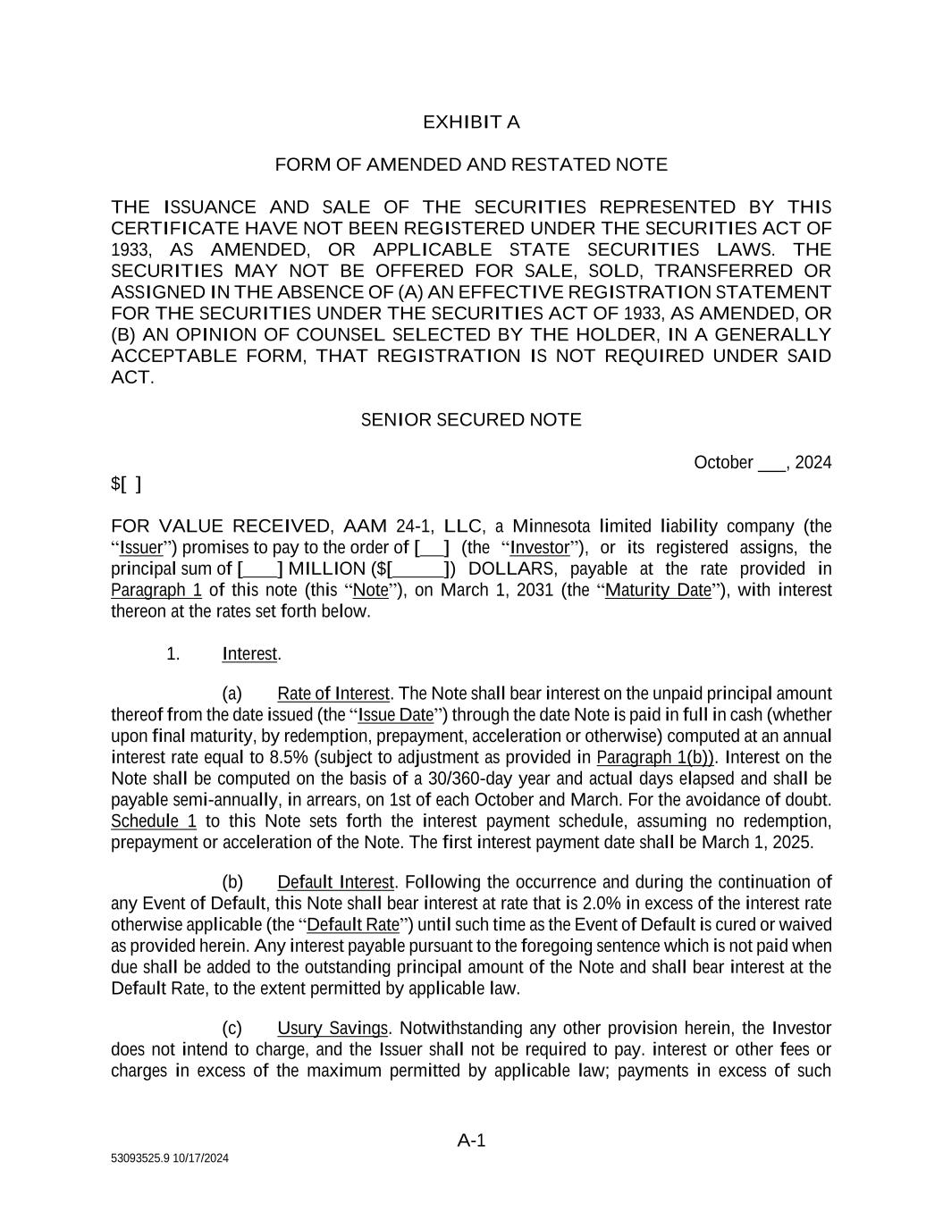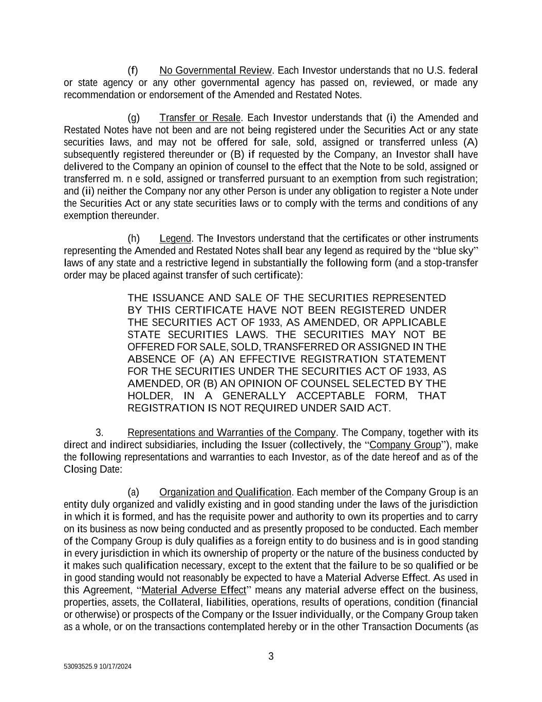 3 53093525.9 10/17/2024 (f) No Governmental Review. Each Investor understands that no U.S. federal or state agency or any other governmental agency has passed on, reviewed, or made any recommendation or endorsement of the Amended and Restated Notes. (g) Transfer or Resale. Each Investor understands that (i) the Amended and Restated Notes have not been and are not being registered under the Securities Act or any state securities laws, and may not be offered for sale, sold, assigned or transferred unless (A) subsequently registered thereunder or (B) if requested by the Company, an Investor shall have delivered to the Company an opinion of counsel to the effect that the Note to be sold, assigned or transferred m. n e sold, assigned or transferred pursuant to an exemption from such registration; and (ii) neither the Company nor any other Person is under any obligation to register a Note under the Securities Act or any state securities laws or to comply with the terms and conditions of any exemption thereunder. (h) Legend. The Investors understand that the certificates or other instruments representing the Amended and Restated Notes shall bear any legend as required by the “blue sky” laws of any state and a restrictive legend in substantially the following form (and a stop-transfer order may be placed against transfer of such certificate): THE ISSUANCE AND SALE OF THE SECURITIES REPRESENTED BY THIS CERTIFICATE HAVE NOT BEEN REGISTERED UNDER THE SECURITIES ACT OF 1933, AS AMENDED, OR APPLICABLE STATE SECURITIES LAWS. THE SECURITIES MAY NOT BE OFFERED FOR SALE, SOLD, TRANSFERRED OR ASSIGNED IN THE ABSENCE OF (A) AN EFFECTIVE REGISTRATION STATEMENT FOR THE SECURITIES UNDER THE SECURITIES ACT OF 1933, AS AMENDED, OR (B) AN OPINION OF COUNSEL SELECTED BY THE HOLDER, IN A GENERALLY ACCEPTABLE FORM, THAT REGISTRATION IS NOT REQUIRED UNDER SAID ACT. 3. Representations and Warranties of the Company. The Company, together with its direct and indirect subsidiaries, including the Issuer (collectively, the “Company Group”), make the following representations and warranties to each Investor, as of the date hereof and as of the Closing Date: (a) Organization and Qualification. Each member of the Company Group is an entity duly organized and validly existing and in good standing under the laws of the jurisdiction in which it is formed, and has the requisite power and authority to own its properties and to carry on its business as now being conducted and as presently proposed to be conducted. Each member of the Company Group is duly qualifies as a foreign entity to do business and is in good standing in every jurisdiction in which its ownership of property or the nature of the business conducted by it makes such qualification necessary, except to the extent that the failure to be so qualified or be in good standing would not reasonably be expected to have a Material Adverse Effect. As used in this Agreement, “Material Adverse Effect” means any material adverse effect on the business, properties, assets, the Collateral, liabilities, operations, results of operations, condition (financial or otherwise) or prospects of the Company or the Issuer individually, or the Company Group taken as a whole, or on the transactions contemplated hereby or in the other Transaction Documents (as