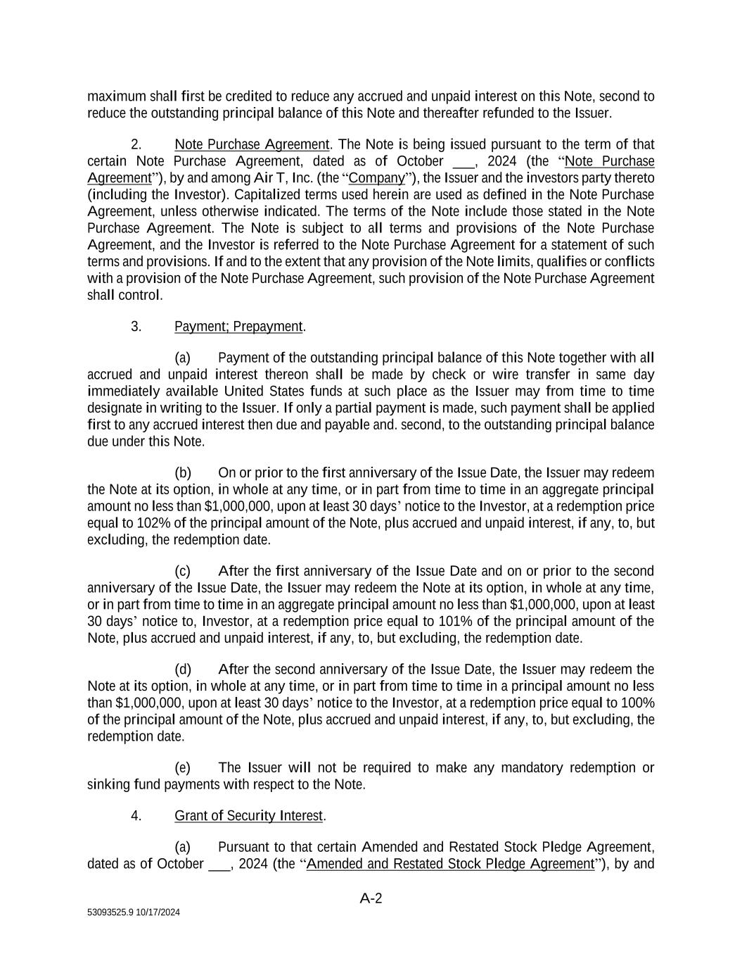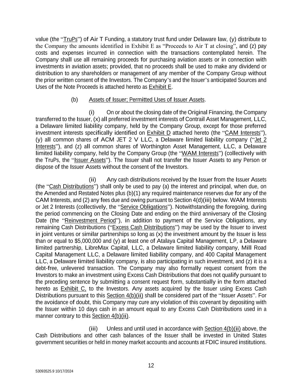 12 53093525.9 10/17/2024 value (the “TruPs”) of Air T Funding, a statutory trust fund under Delaware law, (y) distribute to the Company the amounts identified in Exhibit E as “Proceeds to Air T at closing”, and (z) pay costs and expenses incurred in connection with the transactions contemplated herein. The Company shall use all remaining proceeds for purchasing aviation assets or in connection with investments in aviation assets; provided, that no proceeds shall be used to make any dividend or distribution to any shareholders or management of any member of the Company Group without the prior written consent of the Investors. The Company’s and the Issuer’s anticipated Sources and Uses of the Note Proceeds is attached hereto as Exhibit E. (b) Assets of Issuer; Permitted Uses of Issuer Assets. (i) On or about the closing date of the Original Financing, the Company transferred to the Issuer, (x) all preferred investment interests of Contrail Asset Management, LLC, a Delaware limited liability company, held by the Company Group, except for those preferred investment interests specifically identified on Exhibit D attached hereto (the “CAM Interests”), (y) all common shares of ACM JET 2 V LLC, a Delaware limited liability company (“Jet 2 Interests”), and (z) all common shares of Worthington Asset Management, LLC, a Delaware limited liability company, held by the Company Group (the “WAM Interests”) (collectively with the TruPs, the “Issuer Assets”). The Issuer shall not transfer the Issuer Assets to any Person or dispose of the Issuer Assets without the consent of the Investors. (ii) Any cash distributions received by the Issuer from the Issuer Assets (the “Cash Distributions”) shall only be used to pay (a) the interest and principal, when due, on the Amended and Restated Notes plus (b)(1) any required maintenance reserves due for any of the CAM Interests, and (2) any fees due and owing pursuant to Section 4(d)(iii) below. WAM Interests or Jet 2 Interests (collectively, the “Service Obligations”). Notwithstanding the foregoing, during the period commencing on the Closing Date and ending on the third anniversary of the Closing Date (the “Reinvestment Period”), in addition to payment of the Service Obligations, any remaining Cash Distributions (“Excess Cash Distributions”) may be used by the Issuer to invest in joint ventures or similar partnerships so long as (x) the investment amount by the Issuer is less than or equal to $5,000,000 and (y) at least one of Atalaya Capital Management, LP, a Delaware limited partnership, LibreMax Capital, LLC, a Delaware limited liability company, Mill Road Capital Management LLC, a Delaware limited liability company, and 400 Capital Management LLC, a Delaware limited liability company, is also participating in such investment, and (z) it is a debt-free, unlevered transaction. The Company may also formally request consent from the Investors to make an investment using Excess Cash Distributions that does not qualify pursuant to the preceding sentence by submitting a consent request form, substantially in the form attached hereto as Exhibit C, to the Investors. Any assets acquired by the Issuer using Excess Cash Distributions pursuant to this Section 4(b)(ii) shall be considered part of the “Issuer Assets”. For the avoidance of doubt, this Company may cure any violation of this covenant by depositing with the Issuer within 10 days cash in an amount equal to any Excess Cash Distributions used in a manner contrary to this Section 4(b)(ii). (iii) Unless and until used in accordance with Section 4(b)(ii) above, the Cash Distributions and other cash balances of the Issuer shall be invested in United States government securities or held in money market accounts and accounts at FDIC insured institutions.