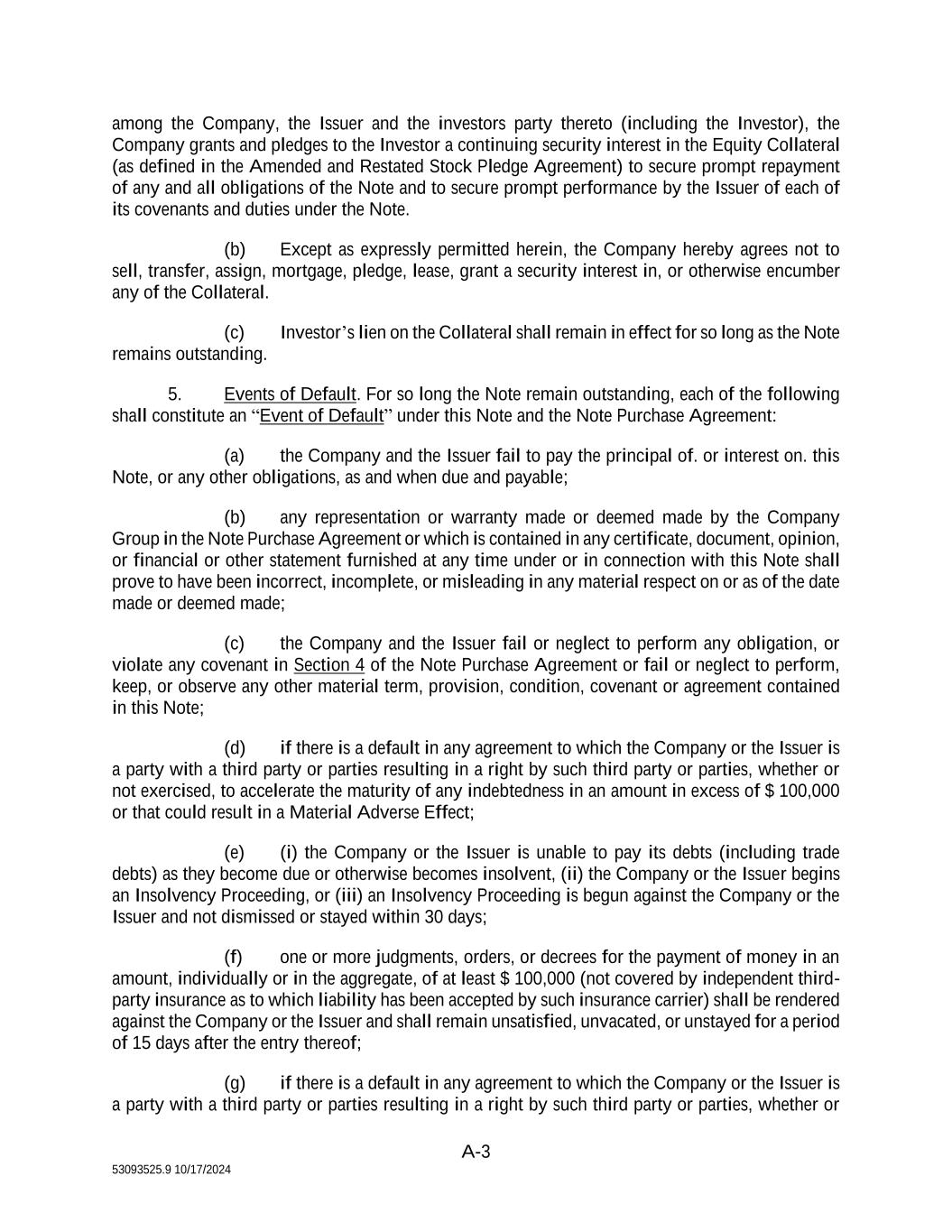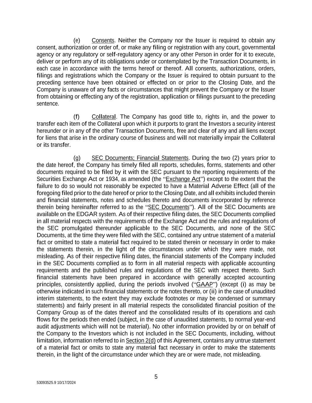 5 53093525.9 10/17/2024 (e) Consents. Neither the Company nor the Issuer is required to obtain any consent, authorization or order of, or make any filing or registration with any court, governmental agency or any regulatory or self-regulatory agency or any other Person in order for it to execute, deliver or perform any of its obligations under or contemplated by the Transaction Documents, in each case in accordance with the terms hereof or thereof. All consents, authorizations, orders, filings and registrations which the Company or the Issuer is required to obtain pursuant to the preceding sentence have been obtained or effected on or prior to the Closing Date, and the Company is unaware of any facts or circumstances that might prevent the Company or the Issuer from obtaining or effecting any of the registration, application or filings pursuant to the preceding sentence. (f) Collateral. The Company has good title to, rights in, and the power to transfer each item of the Collateral upon which it purports to grant the Investors a security interest hereunder or in any of the other Transaction Documents, free and clear of any and all liens except for liens that arise in the ordinary course of business and will not materially impair the Collateral or its transfer. (g) SEC Documents; Financial Statements. During the two (2) years prior to the date hereof, the Company has timely filed all reports, schedules, forms, statements and other documents required to be filed by it with the SEC pursuant to the reporting requirements of the Securities Exchange Act or 1934, as amended (the “Exchange Act”) except to the extent that the failure to do so would not reasonably be expected to have a Material Adverse Effect (all of the foregoing filed prior to the date hereof or prior to the Closing Date, and all exhibits included therein and financial statements, notes and schedules thereto and documents incorporated by reference therein being hereinafter referred to as the “SEC Documents”). All of the SEC Documents are available on the EDGAR system. As of their respective filing dates, the SEC Documents complied in all material respects with the requirements of the Exchange Act and the rules and regulations of the SEC promulgated thereunder applicable to the SEC Documents, and none of the SEC Documents, at the time they were filed with the SEC, contained any untrue statement of a material fact or omitted to state a material fact required to be stated therein or necessary in order to make the statements therein, in the light of the circumstances under which they were made, not misleading. As of their respective filing dates, the financial statements of the Company included in the SEC Documents complied as to form in all material respects with applicable accounting requirements and the published rules and regulations of the SEC with respect thereto. Such financial statements have been prepared in accordance with generally accepted accounting principles, consistently applied, during the periods involved (“GAAP”) (except (i) as may be otherwise indicated in such financial statements or the notes thereto, or (ii) in the case of unaudited interim statements, to the extent they may exclude footnotes or may be condensed or summary statements) and fairly present in all material respects the consolidated financial position of the Company Group as of the dates thereof and the consolidated results of its operations and cash flows for the periods then ended (subject, in the case of unaudited statements, to normal year-end audit adjustments which will not be material). No other information provided by or on behalf of the Company to the Investors which is not included in the SEC Documents, including, without limitation, information referred to in Section 2(d) of this Agreement, contains any untrue statement of a material fact or omits to state any material fact necessary in order to make the statements therein, in the light of the circumstance under which they are or were made, not misleading.