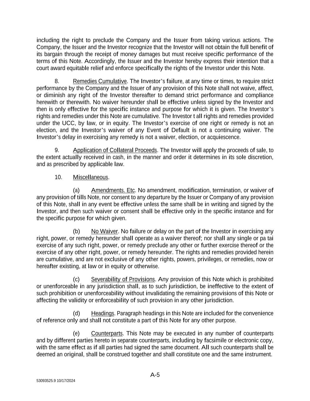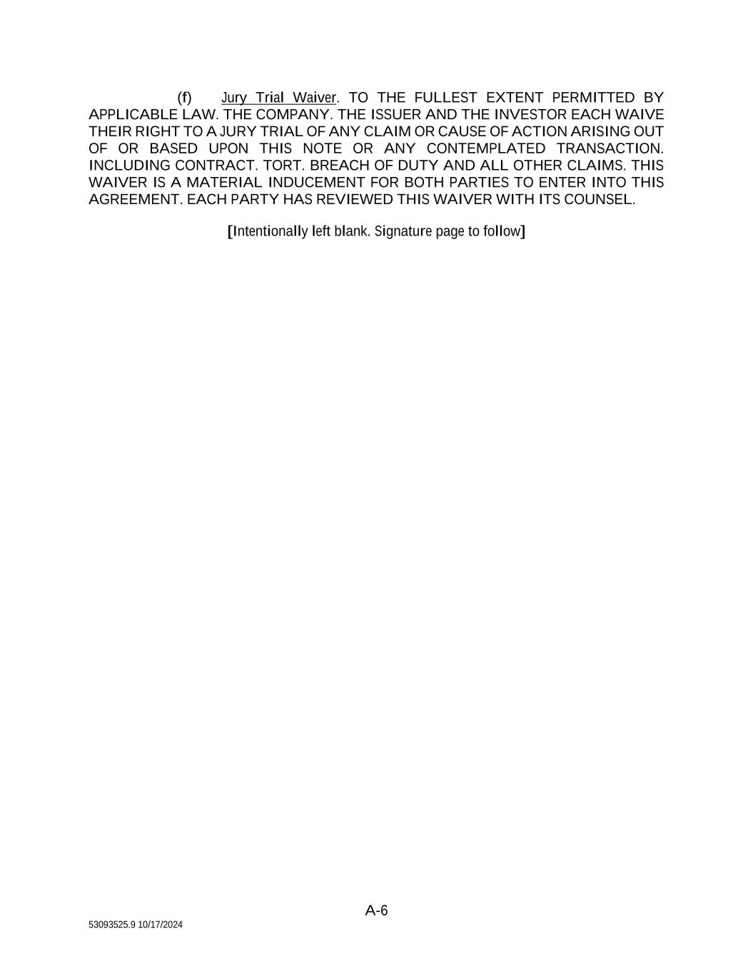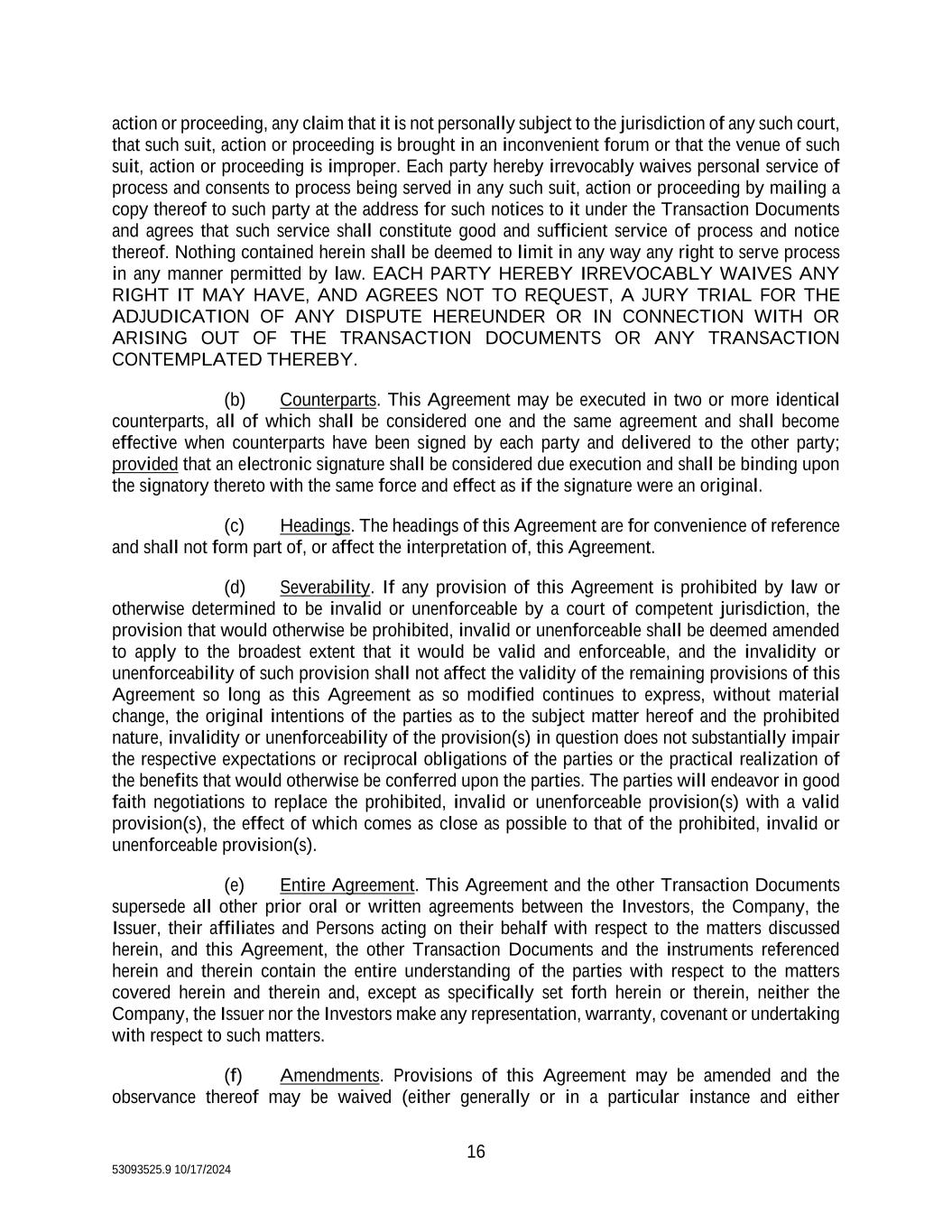 16 53093525.9 10/17/2024 action or proceeding, any claim that it is not personally subject to the jurisdiction of any such court, that such suit, action or proceeding is brought in an inconvenient forum or that the venue of such suit, action or proceeding is improper. Each party hereby irrevocably waives personal service of process and consents to process being served in any such suit, action or proceeding by mailing a copy thereof to such party at the address for such notices to it under the Transaction Documents and agrees that such service shall constitute good and sufficient service of process and notice thereof. Nothing contained herein shall be deemed to limit in any way any right to serve process in any manner permitted by law. EACH PARTY HEREBY IRREVOCABLY WAIVES ANY RIGHT IT MAY HAVE, AND AGREES NOT TO REQUEST, A JURY TRIAL FOR THE ADJUDICATION OF ANY DISPUTE HEREUNDER OR IN CONNECTION WITH OR ARISING OUT OF THE TRANSACTION DOCUMENTS OR ANY TRANSACTION CONTEMPLATED THEREBY. (b) Counterparts. This Agreement may be executed in two or more identical counterparts, all of which shall be considered one and the same agreement and shall become effective when counterparts have been signed by each party and delivered to the other party; provided that an electronic signature shall be considered due execution and shall be binding upon the signatory thereto with the same force and effect as if the signature were an original. (c) Headings. The headings of this Agreement are for convenience of reference and shall not form part of, or affect the interpretation of, this Agreement. (d) Severability. If any provision of this Agreement is prohibited by law or otherwise determined to be invalid or unenforceable by a court of competent jurisdiction, the provision that would otherwise be prohibited, invalid or unenforceable shall be deemed amended to apply to the broadest extent that it would be valid and enforceable, and the invalidity or unenforceability of such provision shall not affect the validity of the remaining provisions of this Agreement so long as this Agreement as so modified continues to express, without material change, the original intentions of the parties as to the subject matter hereof and the prohibited nature, invalidity or unenforceability of the provision(s) in question does not substantially impair the respective expectations or reciprocal obligations of the parties or the practical realization of the benefits that would otherwise be conferred upon the parties. The parties will endeavor in good faith negotiations to replace the prohibited, invalid or unenforceable provision(s) with a valid provision(s), the effect of which comes as close as possible to that of the prohibited, invalid or unenforceable provision(s). (e) Entire Agreement. This Agreement and the other Transaction Documents supersede all other prior oral or written agreements between the Investors, the Company, the Issuer, their affiliates and Persons acting on their behalf with respect to the matters discussed herein, and this Agreement, the other Transaction Documents and the instruments referenced herein and therein contain the entire understanding of the parties with respect to the matters covered herein and therein and, except as specifically set forth herein or therein, neither the Company, the Issuer nor the Investors make any representation, warranty, covenant or undertaking with respect to such matters. (f) Amendments. Provisions of this Agreement may be amended and the observance thereof may be waived (either generally or in a particular instance and either