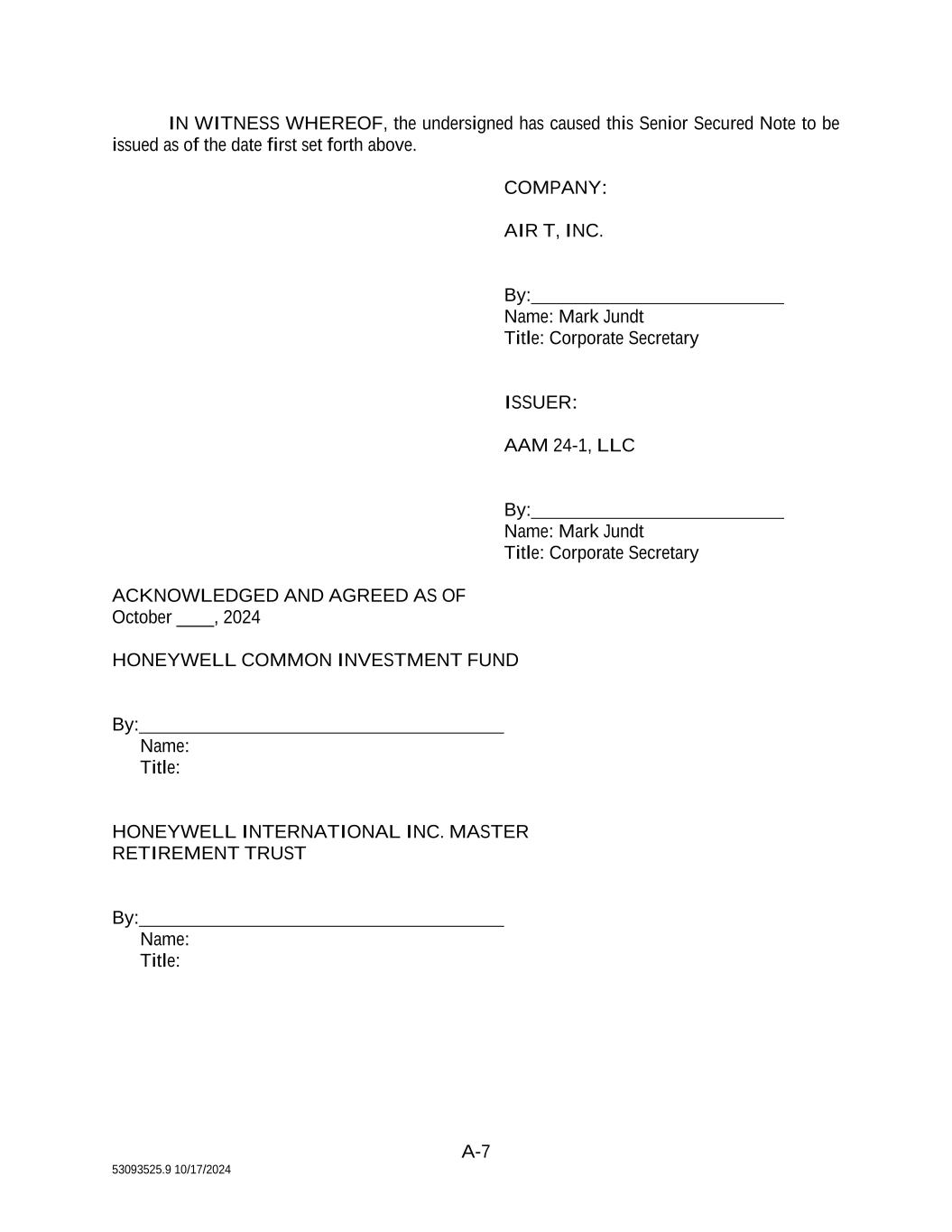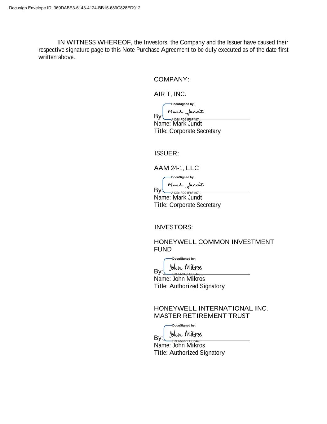 IN WITNESS WHEREOF, the Investors, the Company and the Issuer have caused their respective signature page to this Note Purchase Agreement to be duly executed as of the date first written above. COMPANY: AIR T, INC. By: Name: Mark Jundt Title: Corporate Secretary ISSUER: AAM 24-1, LLC By: Name: Mark Jundt Title: Corporate Secretary INVESTORS: HONEYWELL COMMON INVESTMENT FUND By: Name: John Mikros Title: Authorized Signatory HONEYWELL INTERNATIONAL INC. MASTER RETIREMENT TRUST By: Name: John Mikros Title: Authorized Signatory Docusign Envelope ID: C271E79A-192E-4404-8259-CC0729F11653369DABE3 6143 12 BB15-689C828ED912