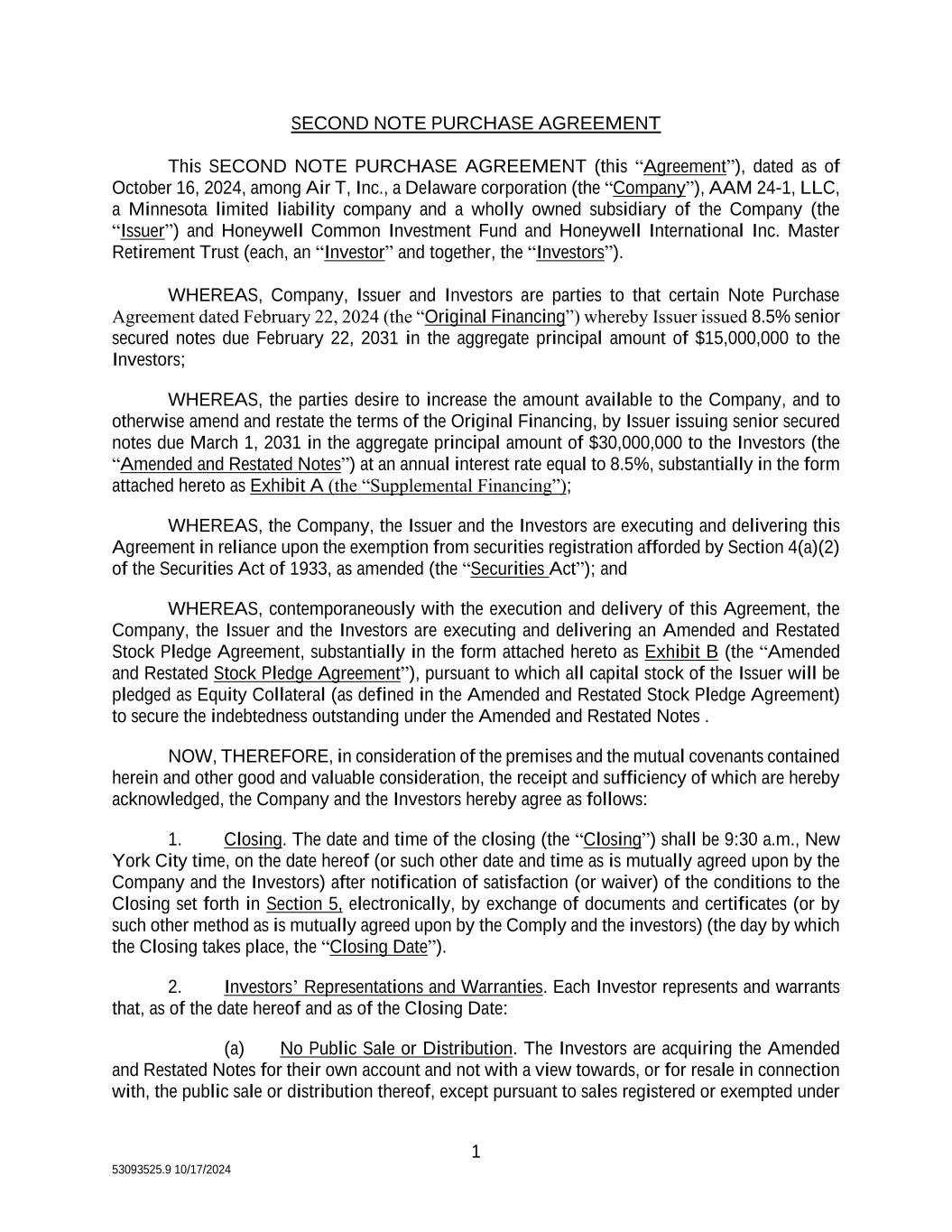1 53093525.9 10/17/2024 SECOND NOTE PURCHASE AGREEMENT This SECOND NOTE PURCHASE AGREEMENT (this “Agreement”), dated as of October 16, 2024, among Air T, Inc., a Delaware corporation (the “Company”), AAM 24-1, LLC, a Minnesota limited liability company and a wholly owned subsidiary of the Company (the “Issuer”) and Honeywell Common Investment Fund and Honeywell International Inc. Master Retirement Trust (each, an “Investor” and together, the “Investors”). WHEREAS, Company, Issuer and Investors are parties to that certain Note Purchase Agreement dated February 22, 2024 (the “Original Financing”) whereby Issuer issued 8.5% senior secured notes due February 22, 2031 in the aggregate principal amount of $15,000,000 to the Investors; WHEREAS, the parties desire to increase the amount available to the Company, and to otherwise amend and restate the terms of the Original Financing, by Issuer issuing senior secured notes due March 1, 2031 in the aggregate principal amount of $30,000,000 to the Investors (the “Amended and Restated Notes”) at an annual interest rate equal to 8.5%, substantially in the form attached hereto as Exhibit A (the “Supplemental Financing”); WHEREAS, the Company, the Issuer and the Investors are executing and delivering this Agreement in reliance upon the exemption from securities registration afforded by Section 4(a)(2) of the Securities Act of 1933, as amended (the “Securities Act”); and WHEREAS, contemporaneously with the execution and delivery of this Agreement, the Company, the Issuer and the Investors are executing and delivering an Amended and Restated Stock Pledge Agreement, substantially in the form attached hereto as Exhibit B (the “Amended and Restated Stock Pledge Agreement”), pursuant to which all capital stock of the Issuer will be pledged as Equity Collateral (as defined in the Amended and Restated Stock Pledge Agreement) to secure the indebtedness outstanding under the Amended and Restated Notes . NOW, THEREFORE, in consideration of the premises and the mutual covenants contained herein and other good and valuable consideration, the receipt and sufficiency of which are hereby acknowledged, the Company and the Investors hereby agree as follows: 1. Closing. The date and time of the closing (the “Closing”) shall be 9:30 a.m., New York City time, on the date hereof (or such other date and time as is mutually agreed upon by the Company and the Investors) after notification of satisfaction (or waiver) of the conditions to the Closing set forth in Section 5, electronically, by exchange of documents and certificates (or by such other method as is mutually agreed upon by the Comply and the investors) (the day by which the Closing takes place, the “Closing Date”). 2. Investors’ Representations and Warranties. Each Investor represents and warrants that, as of the date hereof and as of the Closing Date: (a) No Public Sale or Distribution. The Investors are acquiring the Amended and Restated Notes for their own account and not with a view towards, or for resale in connection with, the public sale or distribution thereof, except pursuant to sales registered or exempted under