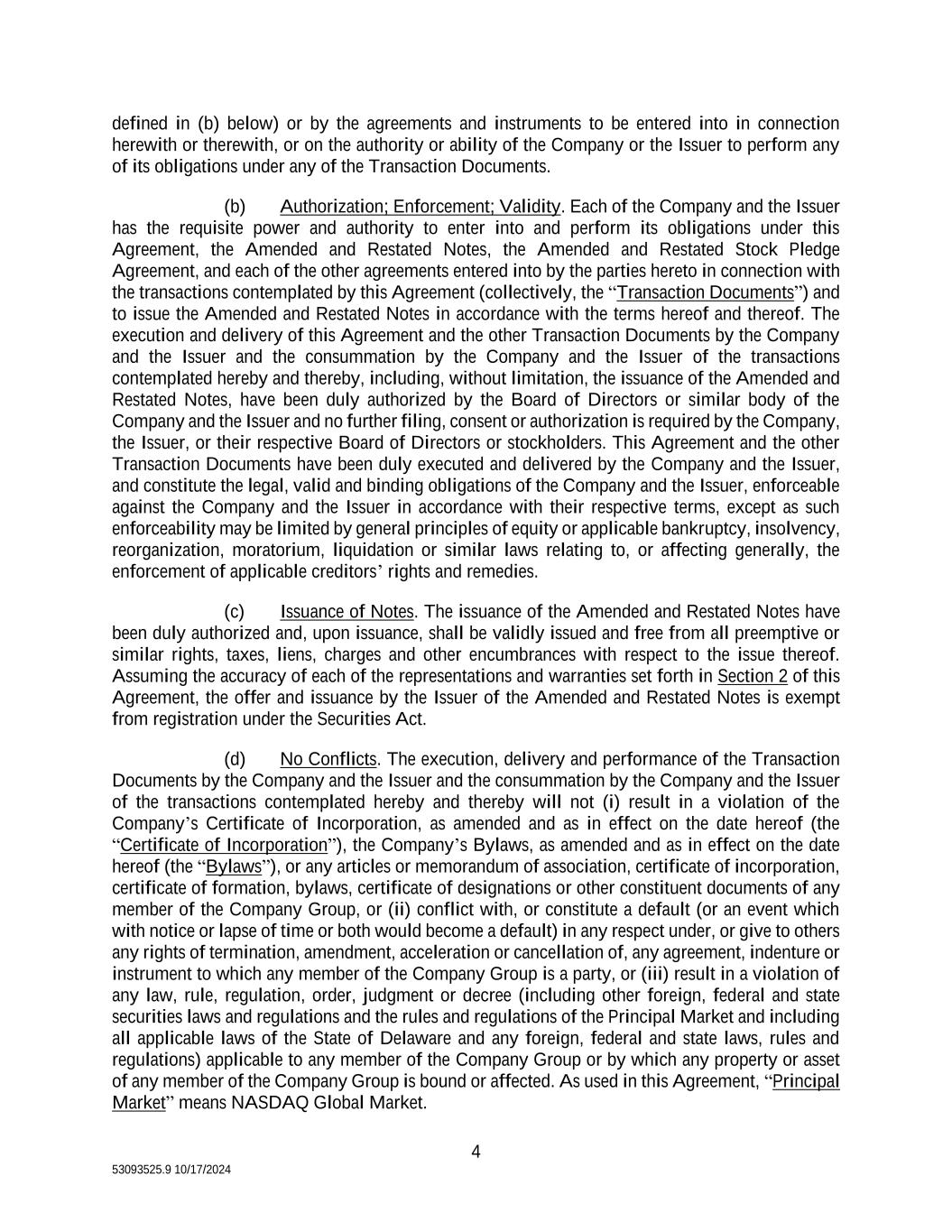 4 53093525.9 10/17/2024 defined in (b) below) or by the agreements and instruments to be entered into in connection herewith or therewith, or on the authority or ability of the Company or the Issuer to perform any of its obligations under any of the Transaction Documents. (b) Authorization; Enforcement; Validity. Each of the Company and the Issuer has the requisite power and authority to enter into and perform its obligations under this Agreement, the Amended and Restated Notes, the Amended and Restated Stock Pledge Agreement, and each of the other agreements entered into by the parties hereto in connection with the transactions contemplated by this Agreement (collectively, the “Transaction Documents”) and to issue the Amended and Restated Notes in accordance with the terms hereof and thereof. The execution and delivery of this Agreement and the other Transaction Documents by the Company and the Issuer and the consummation by the Company and the Issuer of the transactions contemplated hereby and thereby, including, without limitation, the issuance of the Amended and Restated Notes, have been duly authorized by the Board of Directors or similar body of the Company and the Issuer and no further filing, consent or authorization is required by the Company, the Issuer, or their respective Board of Directors or stockholders. This Agreement and the other Transaction Documents have been duly executed and delivered by the Company and the Issuer, and constitute the legal, valid and binding obligations of the Company and the Issuer, enforceable against the Company and the Issuer in accordance with their respective terms, except as such enforceability may be limited by general principles of equity or applicable bankruptcy, insolvency, reorganization, moratorium, liquidation or similar laws relating to, or affecting generally, the enforcement of applicable creditors’ rights and remedies. (c) Issuance of Notes. The issuance of the Amended and Restated Notes have been duly authorized and, upon issuance, shall be validly issued and free from all preemptive or similar rights, taxes, liens, charges and other encumbrances with respect to the issue thereof. Assuming the accuracy of each of the representations and warranties set forth in Section 2 of this Agreement, the offer and issuance by the Issuer of the Amended and Restated Notes is exempt from registration under the Securities Act. (d) No Conflicts. The execution, delivery and performance of the Transaction Documents by the Company and the Issuer and the consummation by the Company and the Issuer of the transactions contemplated hereby and thereby will not (i) result in a violation of the Company’s Certificate of Incorporation, as amended and as in effect on the date hereof (the “Certificate of Incorporation”), the Company’s Bylaws, as amended and as in effect on the date hereof (the “Bylaws”), or any articles or memorandum of association, certificate of incorporation, certificate of formation, bylaws, certificate of designations or other constituent documents of any member of the Company Group, or (ii) conflict with, or constitute a default (or an event which with notice or lapse of time or both would become a default) in any respect under, or give to others any rights of termination, amendment, acceleration or cancellation of, any agreement, indenture or instrument to which any member of the Company Group is a party, or (iii) result in a violation of any law, rule, regulation, order, judgment or decree (including other foreign, federal and state securities laws and regulations and the rules and regulations of the Principal Market and including all applicable laws of the State of Delaware and any foreign, federal and state laws, rules and regulations) applicable to any member of the Company Group or by which any property or asset of any member of the Company Group is bound or affected. As used in this Agreement, “Principal Market” means NASDAQ Global Market.