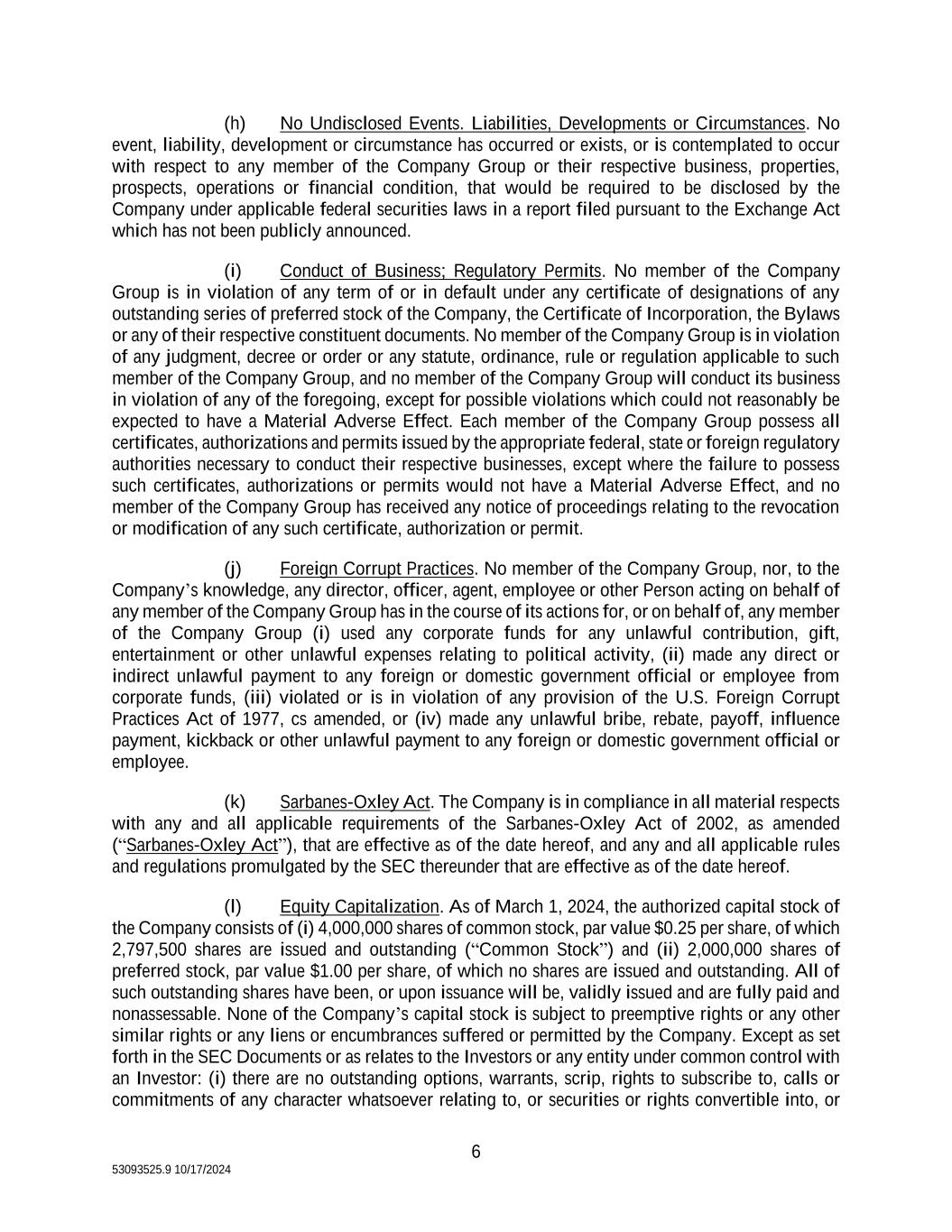 6 53093525.9 10/17/2024 (h) No Undisclosed Events. Liabilities, Developments or Circumstances. No event, liability, development or circumstance has occurred or exists, or is contemplated to occur with respect to any member of the Company Group or their respective business, properties, prospects, operations or financial condition, that would be required to be disclosed by the Company under applicable federal securities laws in a report filed pursuant to the Exchange Act which has not been publicly announced. (i) Conduct of Business; Regulatory Permits. No member of the Company Group is in violation of any term of or in default under any certificate of designations of any outstanding series of preferred stock of the Company, the Certificate of Incorporation, the Bylaws or any of their respective constituent documents. No member of the Company Group is in violation of any judgment, decree or order or any statute, ordinance, rule or regulation applicable to such member of the Company Group, and no member of the Company Group will conduct its business in violation of any of the foregoing, except for possible violations which could not reasonably be expected to have a Material Adverse Effect. Each member of the Company Group possess all certificates, authorizations and permits issued by the appropriate federal, state or foreign regulatory authorities necessary to conduct their respective businesses, except where the failure to possess such certificates, authorizations or permits would not have a Material Adverse Effect, and no member of the Company Group has received any notice of proceedings relating to the revocation or modification of any such certificate, authorization or permit. (j) Foreign Corrupt Practices. No member of the Company Group, nor, to the Company’s knowledge, any director, officer, agent, employee or other Person acting on behalf of any member of the Company Group has in the course of its actions for, or on behalf of, any member of the Company Group (i) used any corporate funds for any unlawful contribution, gift, entertainment or other unlawful expenses relating to political activity, (ii) made any direct or indirect unlawful payment to any foreign or domestic government official or employee from corporate funds, (iii) violated or is in violation of any provision of the U.S. Foreign Corrupt Practices Act of 1977, cs amended, or (iv) made any unlawful bribe, rebate, payoff, influence payment, kickback or other unlawful payment to any foreign or domestic government official or employee. (k) Sarbanes-Oxley Act. The Company is in compliance in all material respects with any and all applicable requirements of the Sarbanes-Oxley Act of 2002, as amended (“Sarbanes-Oxley Act”), that are effective as of the date hereof, and any and all applicable rules and regulations promulgated by the SEC thereunder that are effective as of the date hereof. (l) Equity Capitalization. As of March 1, 2024, the authorized capital stock of the Company consists of (i) 4,000,000 shares of common stock, par value $0.25 per share, of which 2,797,500 shares are issued and outstanding (“Common Stock”) and (ii) 2,000,000 shares of preferred stock, par value $1.00 per share, of which no shares are issued and outstanding. All of such outstanding shares have been, or upon issuance will be, validly issued and are fully paid and nonassessable. None of the Company’s capital stock is subject to preemptive rights or any other similar rights or any liens or encumbrances suffered or permitted by the Company. Except as set forth in the SEC Documents or as relates to the Investors or any entity under common control with an Investor: (i) there are no outstanding options, warrants, scrip, rights to subscribe to, calls or commitments of any character whatsoever relating to, or securities or rights convertible into, or