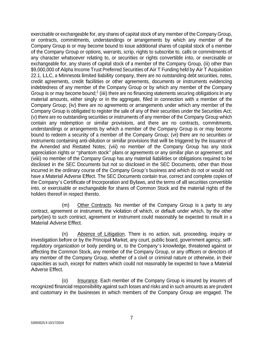 7 53093525.9 10/17/2024 exercisable or exchangeable for, any shares of capital stock of any member of the Company Group, or contracts, commitments, understandings or arrangements by which any member of the Company Group is or may become bound to issue additional shares of capital stock of a member of the Company Group or options, warrants, scrip, rights to subscribe to, calls or commitments of any character whatsoever relating to, or securities or rights convertible into, or exercisable or exchangeable for, any shares of capital stock of a member of the Company Group, (ii) other than $9,000,000 of Alpha Income Trust Preferred Securities of Air T Funding held by Air T Acquisition 22.1, LLC, a Minnesota limited liability company, there are no outstanding debt securities, notes, credit agreements, credit facilities or other agreements, documents or instruments evidencing indebtedness of any member of the Company Group or by which any member of the Company Group is or may become bound;1 (iii) there are no financing statements securing obligations in any material amounts, either singly or in the aggregate, filed in connection with a member of the Company Group; (iv) there are no agreements or arrangements under which any member of the Company Group is obligated to register the sale of any of their securities under the Securities Act; (v) there are no outstanding securities or instruments of any member of the Company Group which contain any redemption or similar provisions, and there are no contracts, commitments, understandings or arrangements by which a member of the Company Group is or may become bound to redeem a security of a member of the Company Group; (vi) there are no securities or instruments containing anti-dilution or similar provisions that will be triggered by the issuance of the Amended and Restated Notes; (vii) no member of the Company Group has any stock appreciation rights or “phantom stock” plans or agreements or any similar plan or agreement; and (viii) no member of the Company Group has any material liabilities or obligations required to be disclosed in the SEC Documents but not so disclosed in the SEC Documents, other than those incurred in the ordinary course of the Company Group’s business and which do not or would not have a Material Adverse Effect. The SEC Documents contain true, correct and complete copies of the Company’s Certificate of Incorporation and Bylaws, and the terms of all securities convertible into, or exercisable or exchangeable for shares of Common Stock and the material rights of the holders thereof in respect thereto. (m) Other Contracts. No member of the Company Group is a party to any contract, agreement or instrument, the violation of which, or default under which, by the other party(ies) to such contract, agreement or instrument could reasonably be expected to result in a Material Adverse Effect. (n) Absence of Litigation. There is no action, suit, proceeding, inquiry or investigation before or by the Principal Market, any court, public board, government agency, self- regulatory organization or body pending or, to the Company’s knowledge, threatened against or affecting the Common Stock, any member of the Company Group, or any officers or directors of any member of the Company Group, whether of a civil or criminal nature or otherwise, in their capacities as such, except for matters which could not reasonably be expected to have a Material Adverse Effect. (o) Insurance. Each member of the Company Group is insured by insurers of recognized financial responsibility against such losses and risks and in such amounts as are prudent and customary in the businesses in which members of the Company Group are engaged. The