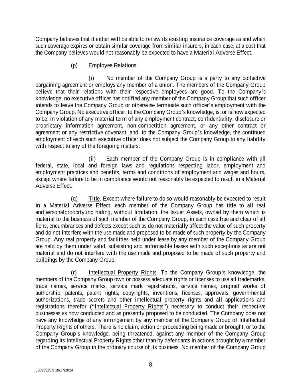 8 53093525.9 10/17/2024 Company believes that it either will be able to renew its existing insurance coverage as and when such coverage expires or obtain similar coverage from similar insurers, in each case, at a cost that the Company believes would not reasonably be expected to have a Material Adverse Effect. (p) Employee Relations. (i) No member of the Company Group is a party to any collective bargaining agreement or employs any member of a union. The members of the Company Group believe that their relations with their respective employees are good. To the Company’s knowledge, no executive officer has notified any member of the Company Group that such officer intends to leave the Company Group or otherwise terminate such officer’s employment with the Company Group. No executive officer, to the Company Group’s knowledge, is, or is now expected to be, in violation of any material term of any employment contract, confidentiality, disclosure or proprietary information agreement, non-competition agreement, or any other contract or agreement or any restrictive covenant, and, to the Company Group’s knowledge, the continued employment of each such executive officer does not subject the Company Group to any liability with respect to any of the foregoing matters. (ii) Each member of the Company Group is in compliance with all federal, state, local and foreign laws and regulations respecting labor, employment and employment practices and benefits, terms and conditions of employment and wages and hours, except where failure to be in compliance would not reasonably be expected to result in a Material Adverse Effect. (q) Title. Except where failure to do so would reasonably be expected to result in a Material Adverse Effect, each member of the Company Group has title to all real and]wrsonalproocrty.inc hiding, without limitation, the Issuer Assets, owned by them which is material to the business of such member of the Company Group, in each case free and clear of all liens, encumbrances and defects except such as do not materially affect the value of such property and do not interfere with the use made and proposed to be made of such property by the Company Group. Any real property and facilities held under lease by any member of the Company Group are held by them under valid, subsisting and enforceable leases with such exceptions as are not material and do not interfere with the use made and proposed to be made of such property and buildings by the Company Group. (r) Intellectual Property Rights. To the Company Group’s knowledge, the members of the Company Group own or possess adequate rights or licenses to use all trademarks, trade names, service marks, service mark registrations, service names, original works of authorship, patents, patent rights, copyrights, inventions, licenses, approvals, governmental authorizations, trade secrets and other intellectual property rights and all applications and registrations therefor (“Intellectual Property Rights”) necessary to conduct their respective businesses as now conducted and as presently proposed to be conducted. The Company does not have any knowledge of any infringement by any member of the Company Group of Intellectual Property Rights of others. There is no claim, action or proceeding being made or brought, or to the Company Group’s knowledge, being threatened, against any member of the Company Group regarding its Intellectual Property Rights other than by defendants in actions brought by a member of the Company Group in the ordinary course of its business. No member of the Company Group