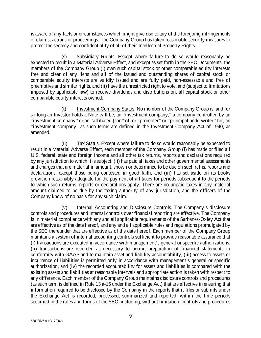 9 53093525.9 10/17/2024 is aware of any facts or circumstances which might give rise to any of the foregoing infringements or claims, actions or proceedings. The Company Group has taken reasonable security measures to protect the secrecy and confidentiality of all of their Intellectual Property Rights. (s) Subsidiary Rights. Except where failure to do so would reasonably be expected to result in a Material Adverse Effect, and except as set forth in the SEC Documents, the members of the Company Group (i) own such capital stock or other comparable equity interests free and clear of any liens and all of the issued and outstanding shares of capital stock or comparable equity interests are validly issued and are fully paid, non-assessable and free of preemptive and similar rights, and (ii) have the unrestricted right to vote, and (subject to limitations imposed by applicable law) to receive dividends and distributions on, all capital stock or other comparable equity interests owned. (t) Investment Company Status. No member of the Company Group is, and for so long an Investor holds a Note will be, an “investment company,” a company controlled by an “investment company” or an “affiliated (son” of, or “promoter” or “principal underwriter” for, an “investment company” as such terms are defined in the Investment Company Act of 1940, as amended. (u) Tax Status. Except where failure to do so would reasonably be expected to result in a Material Adverse Effect, each member of the Company Group (i) has made or filed all U.S. federal, state and foreign income and all other tax returns, reports and declarations required by any jurisdiction to which it is subject, (ii) has paid all taxes and other governmental assessments and charges that are material in amount, shown or determined to be due on such ref is, reports and declarations, except those being contested in good faith, and (iii) has set aside on its books provision reasonably adequate for the payment of all taxes for periods subsequent to the periods to which such returns, reports or declarations apply. There are no unpaid taxes in any material amount claimed to be due by the taxing authority of any jurisdiction, and the officers of the Company know of no basis for any such claim. (v) Internal Accounting and Disclosure Controls. The Company’s disclosure controls and procedures and internal controls over financial reporting are effective. The Company is in material compliance with any and all applicable requirements of the Sarbanes-Oxley Act that are effective as of the date hereof, and any and all applicable rules and regulations promulgated by the SEC thereunder that are effective as of the date hereof. Each member of the Company Group maintains a system of internal accounting controls sufficient to provide reasonable assurance that (i) transactions are executed in accordance with management’s general or specific authorizations, (ii) transactions are recorded as necessary to permit preparation of financial statements in conformity with GAAP and to maintain asset and liability accountability, (iii) access to assets or incurrence of liabilities is permitted only in accordance with management’s general or specific authorization, and (iv) the recorded accountability for assets and liabilities is compared with the existing assets and liabilities at reasonable intervals and appropriate action is taken with respect to any difference. Each member of the Company Group maintains disclosure controls and procedures (as such term is defined in Rule 13 a-15 under the Exchange Act) that are effective in ensuring that information required to be disclosed by the Company in the reports that it files or submits under the Exchange Act is recorded, processed, summarized and reported, within the time periods specified in the rules and forms of the SEC, including, without limitation, controls and procedures