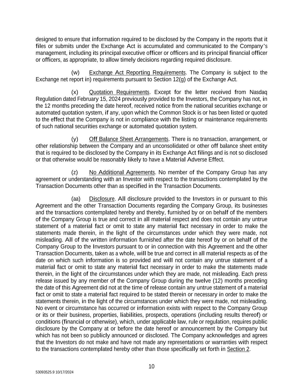 10 53093525.9 10/17/2024 designed to ensure that information required to be disclosed by the Company in the reports that it files or submits under the Exchange Act is accumulated and communicated to the Company’s management, including its principal executive officer or officers and its principal financial officer or officers, as appropriate, to allow timely decisions regarding required disclosure. (w) Exchange Act Reporting Requirements. The Company is subject to the Exchange net report in) requirements pursuant to Section 12(g) of the Exchange Act. (x) Quotation Requirements. Except for the letter received from Nasdaq Regulation dated February 15, 2024 previously provided to the Investors, the Company has not, in the 12 months preceding the date hereof, received notice from the national securities exchange or automated quotation system, if any, upon which the Common Stock is or has been listed or quoted to the effect that the Company is not in compliance with the listing or maintenance requirements of such national securities exchange or automated quotation system. (y) Off Balance Sheet Arrangements. There is no transaction, arrangement, or other relationship between the Company and an unconsolidated or other off balance sheet entity that is required to be disclosed by the Company in its Exchange Act filings and is not so disclosed or that otherwise would be reasonably likely to have a Material Adverse Effect. (z) No Additional Agreements. No member of the Company Group has any agreement or understanding with an Investor with respect to the transactions contemplated by the Transaction Documents other than as specified in the Transaction Documents. (aa) Disclosure. All disclosure provided to the Investors in or pursuant to this Agreement and the other Transaction Documents regarding the Company Group, its businesses and the transactions contemplated hereby and thereby, furnished by or on behalf of the members of the Company Group is true and correct in all material respect and does not contain any untrue statement of a material fact or omit to state any material fact necessary in order to make the statements made therein, in the light of the circumstances under which they were made, not misleading. All of the written information furnished after the date hereof by or on behalf of the Company Group to the Investors pursuant to or in connection with this Agreement and the other Transaction Documents, taken as a whole, will be true and correct in all material respects as of the date on which such information is so provided and will not contain any untrue statement of a material fact or omit to state any material fact necessary in order to make the statements made therein, in the light of the circumstances under which they are made, not misleading. Each press release issued by any member of the Company Group during the twelve (12) months preceding the date of this Agreement did not at the time of release contain any untrue statement of a material fact or omit to state a material fact required to be stated therein or necessary in order to make the statements therein, in the light of the circumstances under which they were made, not misleading. No event or circumstance has occurred or information exists with respect to the Company Group or its or their business, properties, liabilities, prospects, operations (including results thereof) or conditions (financial or otherwise), which, under applicable law, rule or regulation, requires public disclosure by the Company at or before the date hereof or announcement by the Company but which has not been so publicly announced or disclosed. The Company acknowledges and agrees that the Investors do not make and have not made any representations or warranties with respect to the transactions contemplated hereby other than those specifically set forth in Section 2.