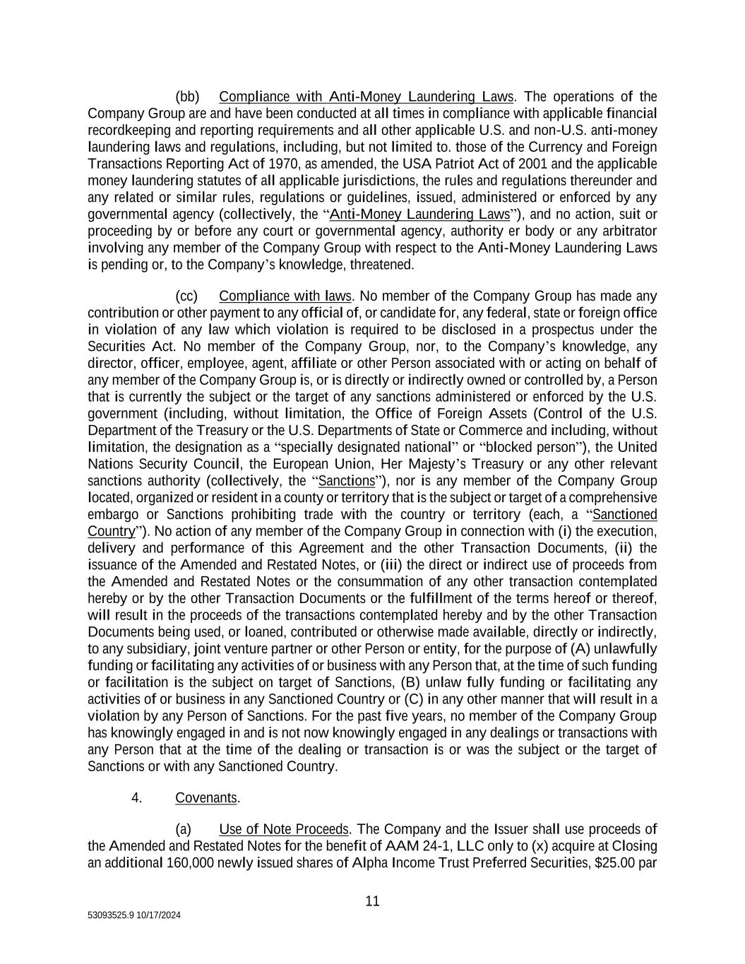 11 53093525.9 10/17/2024 (bb) Compliance with Anti-Money Laundering Laws. The operations of the Company Group are and have been conducted at all times in compliance with applicable financial recordkeeping and reporting requirements and all other applicable U.S. and non-U.S. anti-money laundering laws and regulations, including, but not limited to. those of the Currency and Foreign Transactions Reporting Act of 1970, as amended, the USA Patriot Act of 2001 and the applicable money laundering statutes of all applicable jurisdictions, the rules and regulations thereunder and any related or similar rules, regulations or guidelines, issued, administered or enforced by any governmental agency (collectively, the “Anti-Money Laundering Laws”), and no action, suit or proceeding by or before any court or governmental agency, authority er body or any arbitrator involving any member of the Company Group with respect to the Anti-Money Laundering Laws is pending or, to the Company’s knowledge, threatened. (cc) Compliance with laws. No member of the Company Group has made any contribution or other payment to any official of, or candidate for, any federal, state or foreign office in violation of any law which violation is required to be disclosed in a prospectus under the Securities Act. No member of the Company Group, nor, to the Company’s knowledge, any director, officer, employee, agent, affiliate or other Person associated with or acting on behalf of any member of the Company Group is, or is directly or indirectly owned or controlled by, a Person that is currently the subject or the target of any sanctions administered or enforced by the U.S. government (including, without limitation, the Office of Foreign Assets (Control of the U.S. Department of the Treasury or the U.S. Departments of State or Commerce and including, without limitation, the designation as a “specially designated national” or “blocked person”), the United Nations Security Council, the European Union, Her Majesty’s Treasury or any other relevant sanctions authority (collectively, the “Sanctions”), nor is any member of the Company Group located, organized or resident in a county or territory that is the subject or target of a comprehensive embargo or Sanctions prohibiting trade with the country or territory (each, a “Sanctioned Country”). No action of any member of the Company Group in connection with (i) the execution, delivery and performance of this Agreement and the other Transaction Documents, (ii) the issuance of the Amended and Restated Notes, or (iii) the direct or indirect use of proceeds from the Amended and Restated Notes or the consummation of any other transaction contemplated hereby or by the other Transaction Documents or the fulfillment of the terms hereof or thereof, will result in the proceeds of the transactions contemplated hereby and by the other Transaction Documents being used, or loaned, contributed or otherwise made available, directly or indirectly, to any subsidiary, joint venture partner or other Person or entity, for the purpose of (A) unlawfully funding or facilitating any activities of or business with any Person that, at the time of such funding or facilitation is the subject on target of Sanctions, (B) unlaw fully funding or facilitating any activities of or business in any Sanctioned Country or (C) in any other manner that will result in a violation by any Person of Sanctions. For the past five years, no member of the Company Group has knowingly engaged in and is not now knowingly engaged in any dealings or transactions with any Person that at the time of the dealing or transaction is or was the subject or the target of Sanctions or with any Sanctioned Country. 4. Covenants. (a) Use of Note Proceeds. The Company and the Issuer shall use proceeds of the Amended and Restated Notes for the benefit of AAM 24-1, LLC only to (x) acquire at Closing an additional 160,000 newly issued shares of Alpha Income Trust Preferred Securities, $25.00 par