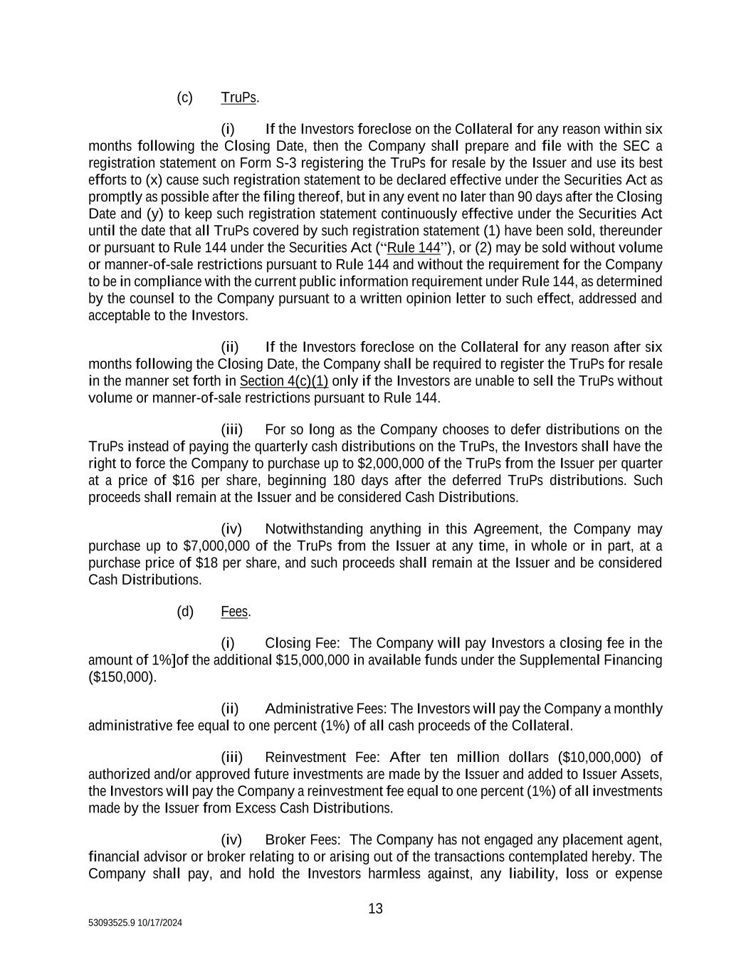 13 53093525.9 10/17/2024 (c) TruPs. (i) If the Investors foreclose on the Collateral for any reason within six months following the Closing Date, then the Company shall prepare and file with the SEC a registration statement on Form S-3 registering the TruPs for resale by the Issuer and use its best efforts to (x) cause such registration statement to be declared effective under the Securities Act as promptly as possible after the filing thereof, but in any event no later than 90 days after the Closing Date and (y) to keep such registration statement continuously effective under the Securities Act until the date that all TruPs covered by such registration statement (1) have been sold, thereunder or pursuant to Rule 144 under the Securities Act (“Rule 144”), or (2) may be sold without volume or manner-of-sale restrictions pursuant to Rule 144 and without the requirement for the Company to be in compliance with the current public information requirement under Rule 144, as determined by the counsel to the Company pursuant to a written opinion letter to such effect, addressed and acceptable to the Investors. (ii) If the Investors foreclose on the Collateral for any reason after six months following the Closing Date, the Company shall be required to register the TruPs for resale in the manner set forth in Section 4(c)(1) only if the Investors are unable to sell the TruPs without volume or manner-of-sale restrictions pursuant to Rule 144. (iii) For so long as the Company chooses to defer distributions on the TruPs instead of paying the quarterly cash distributions on the TruPs, the Investors shall have the right to force the Company to purchase up to $2,000,000 of the TruPs from the Issuer per quarter at a price of $16 per share, beginning 180 days after the deferred TruPs distributions. Such proceeds shall remain at the Issuer and be considered Cash Distributions. (iv) Notwithstanding anything in this Agreement, the Company may purchase up to $7,000,000 of the TruPs from the Issuer at any time, in whole or in part, at a purchase price of $18 per share, and such proceeds shall remain at the Issuer and be considered Cash Distributions. (d) Fees. (i) Closing Fee: The Company will pay Investors a closing fee in the amount of 1%]of the additional $15,000,000 in available funds under the Supplemental Financing ($150,000). (ii) Administrative Fees: The Investors will pay the Company a monthly administrative fee equal to one percent (1%) of all cash proceeds of the Collateral. (iii) Reinvestment Fee: After ten million dollars ($10,000,000) of authorized and/or approved future investments are made by the Issuer and added to Issuer Assets, the Investors will pay the Company a reinvestment fee equal to one percent (1%) of all investments made by the Issuer from Excess Cash Distributions. (iv) Broker Fees: The Company has not engaged any placement agent, financial advisor or broker relating to or arising out of the transactions contemplated hereby. The Company shall pay, and hold the Investors harmless against, any liability, loss or expense