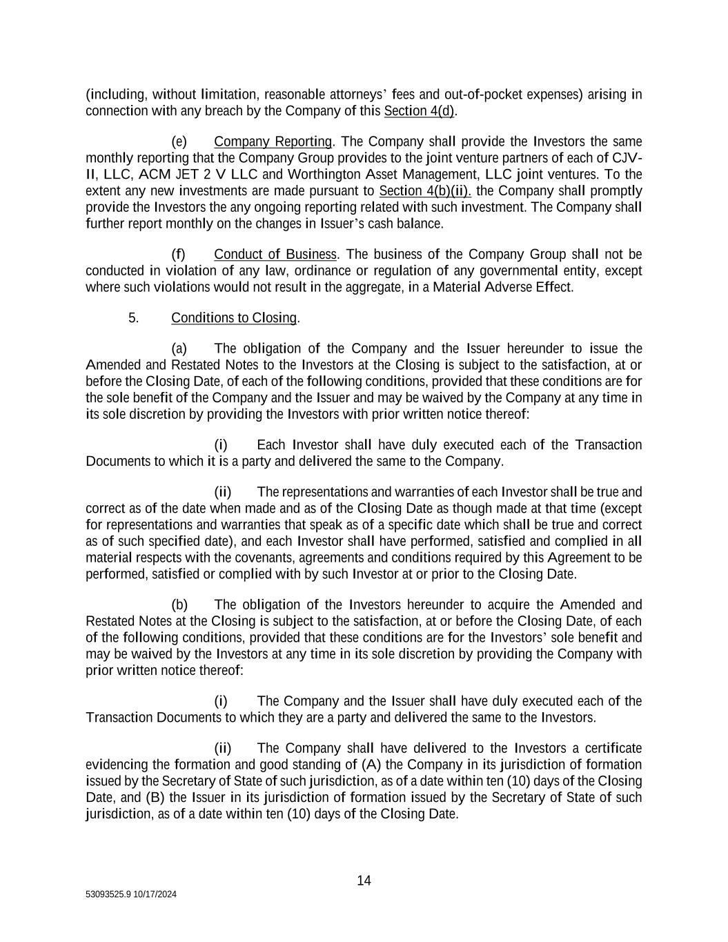 14 53093525.9 10/17/2024 (including, without limitation, reasonable attorneys’ fees and out-of-pocket expenses) arising in connection with any breach by the Company of this Section 4(d). (e) Company Reporting. The Company shall provide the Investors the same monthly reporting that the Company Group provides to the joint venture partners of each of CJV- II, LLC, ACM JET 2 V LLC and Worthington Asset Management, LLC joint ventures. To the extent any new investments are made pursuant to Section 4(b)(ii). the Company shall promptly provide the Investors the any ongoing reporting related with such investment. The Company shall further report monthly on the changes in Issuer’s cash balance. (f) Conduct of Business. The business of the Company Group shall not be conducted in violation of any law, ordinance or regulation of any governmental entity, except where such violations would not result in the aggregate, in a Material Adverse Effect. 5. Conditions to Closing. (a) The obligation of the Company and the Issuer hereunder to issue the Amended and Restated Notes to the Investors at the Closing is subject to the satisfaction, at or before the Closing Date, of each of the following conditions, provided that these conditions are for the sole benefit of the Company and the Issuer and may be waived by the Company at any time in its sole discretion by providing the Investors with prior written notice thereof: (i) Each Investor shall have duly executed each of the Transaction Documents to which it is a party and delivered the same to the Company. (ii) The representations and warranties of each Investor shall be true and correct as of the date when made and as of the Closing Date as though made at that time (except for representations and warranties that speak as of a specific date which shall be true and correct as of such specified date), and each Investor shall have performed, satisfied and complied in all material respects with the covenants, agreements and conditions required by this Agreement to be performed, satisfied or complied with by such Investor at or prior to the Closing Date. (b) The obligation of the Investors hereunder to acquire the Amended and Restated Notes at the Closing is subject to the satisfaction, at or before the Closing Date, of each of the following conditions, provided that these conditions are for the Investors’ sole benefit and may be waived by the Investors at any time in its sole discretion by providing the Company with prior written notice thereof: (i) The Company and the Issuer shall have duly executed each of the Transaction Documents to which they are a party and delivered the same to the Investors. (ii) The Company shall have delivered to the Investors a certificate evidencing the formation and good standing of (A) the Company in its jurisdiction of formation issued by the Secretary of State of such jurisdiction, as of a date within ten (10) days of the Closing Date, and (B) the Issuer in its jurisdiction of formation issued by the Secretary of State of such jurisdiction, as of a date within ten (10) days of the Closing Date.