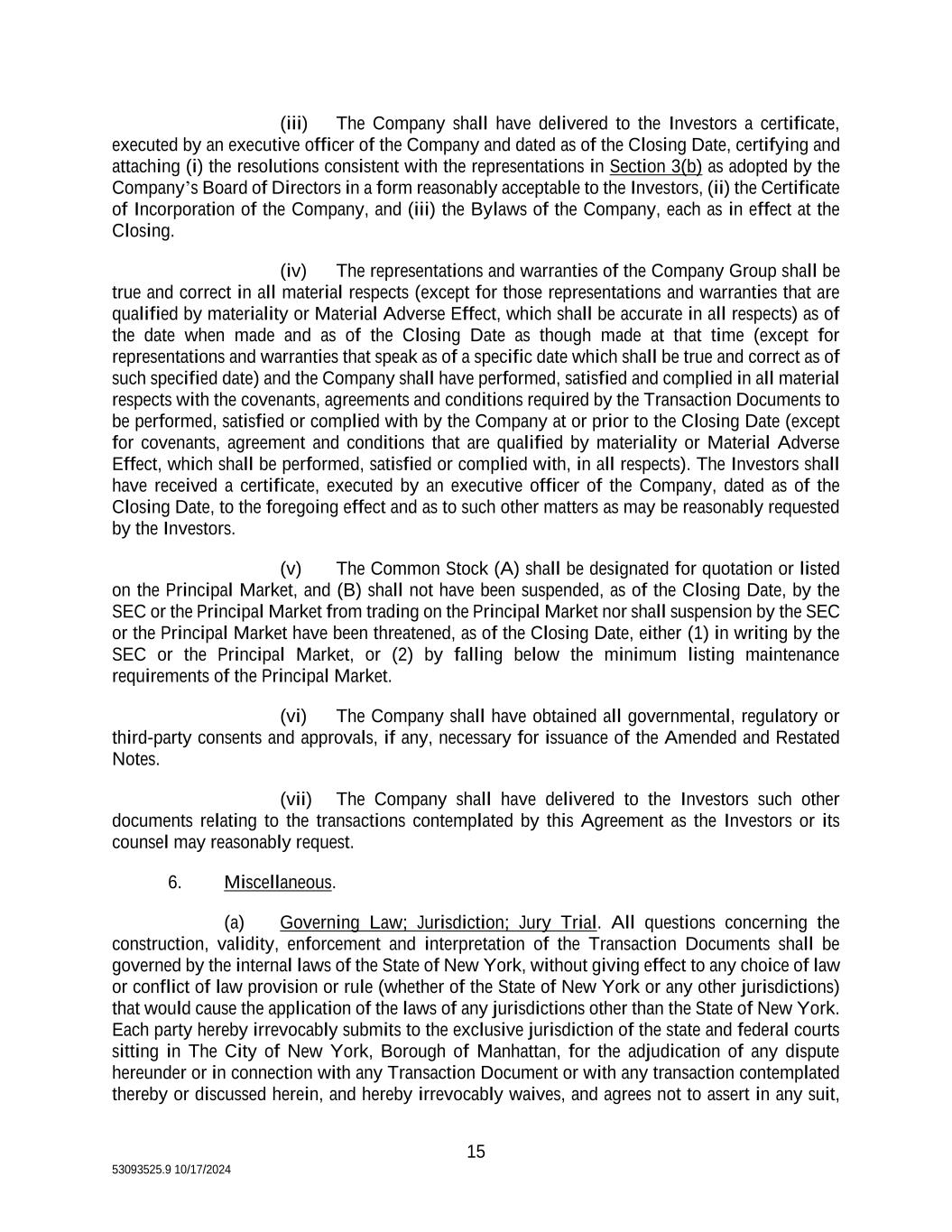 15 53093525.9 10/17/2024 (iii) The Company shall have delivered to the Investors a certificate, executed by an executive officer of the Company and dated as of the Closing Date, certifying and attaching (i) the resolutions consistent with the representations in Section 3(b) as adopted by the Company’s Board of Directors in a form reasonably acceptable to the Investors, (ii) the Certificate of Incorporation of the Company, and (iii) the Bylaws of the Company, each as in effect at the Closing. (iv) The representations and warranties of the Company Group shall be true and correct in all material respects (except for those representations and warranties that are qualified by materiality or Material Adverse Effect, which shall be accurate in all respects) as of the date when made and as of the Closing Date as though made at that time (except for representations and warranties that speak as of a specific date which shall be true and correct as of such specified date) and the Company shall have performed, satisfied and complied in all material respects with the covenants, agreements and conditions required by the Transaction Documents to be performed, satisfied or complied with by the Company at or prior to the Closing Date (except for covenants, agreement and conditions that are qualified by materiality or Material Adverse Effect, which shall be performed, satisfied or complied with, in all respects). The Investors shall have received a certificate, executed by an executive officer of the Company, dated as of the Closing Date, to the foregoing effect and as to such other matters as may be reasonably requested by the Investors. (v) The Common Stock (A) shall be designated for quotation or listed on the Principal Market, and (B) shall not have been suspended, as of the Closing Date, by the SEC or the Principal Market from trading on the Principal Market nor shall suspension by the SEC or the Principal Market have been threatened, as of the Closing Date, either (1) in writing by the SEC or the Principal Market, or (2) by falling below the minimum listing maintenance requirements of the Principal Market. (vi) The Company shall have obtained all governmental, regulatory or third-party consents and approvals, if any, necessary for issuance of the Amended and Restated Notes. (vii) The Company shall have delivered to the Investors such other documents relating to the transactions contemplated by this Agreement as the Investors or its counsel may reasonably request. 6. Miscellaneous. (a) Governing Law; Jurisdiction; Jury Trial. All questions concerning the construction, validity, enforcement and interpretation of the Transaction Documents shall be governed by the internal laws of the State of New York, without giving effect to any choice of law or conflict of law provision or rule (whether of the State of New York or any other jurisdictions) that would cause the application of the laws of any jurisdictions other than the State of New York. Each party hereby irrevocably submits to the exclusive jurisdiction of the state and federal courts sitting in The City of New York, Borough of Manhattan, for the adjudication of any dispute hereunder or in connection with any Transaction Document or with any transaction contemplated thereby or discussed herein, and hereby irrevocably waives, and agrees not to assert in any suit,