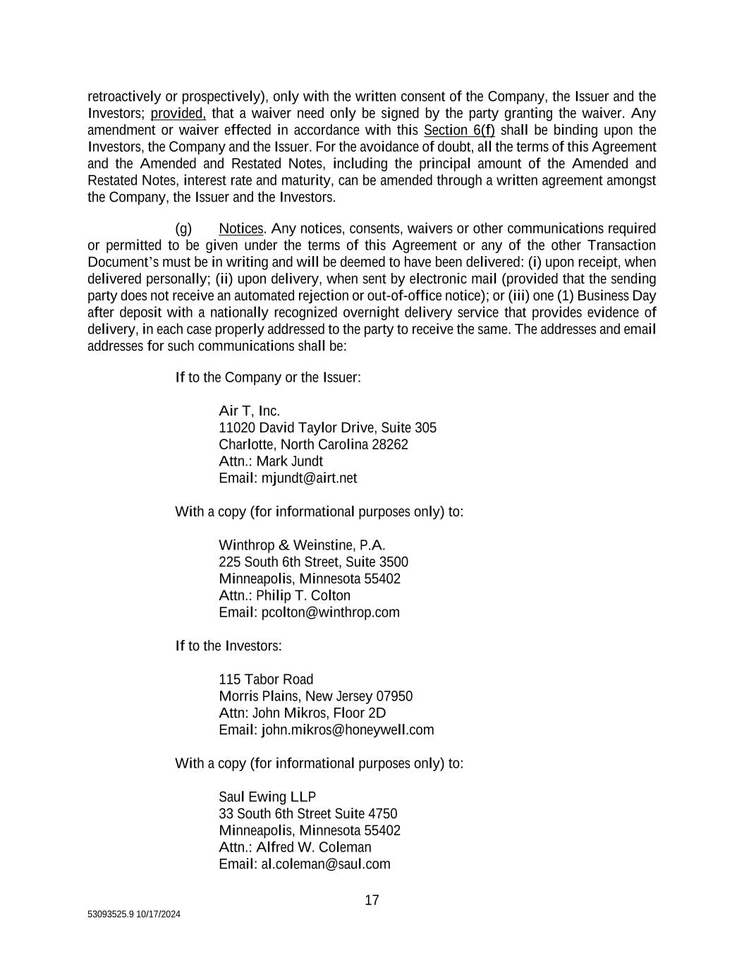 17 53093525.9 10/17/2024 retroactively or prospectively), only with the written consent of the Company, the Issuer and the Investors; provided, that a waiver need only be signed by the party granting the waiver. Any amendment or waiver effected in accordance with this Section 6(f) shall be binding upon the Investors, the Company and the Issuer. For the avoidance of doubt, all the terms of this Agreement and the Amended and Restated Notes, including the principal amount of the Amended and Restated Notes, interest rate and maturity, can be amended through a written agreement amongst the Company, the Issuer and the Investors. (g) Notices. Any notices, consents, waivers or other communications required or permitted to be given under the terms of this Agreement or any of the other Transaction Document’s must be in writing and will be deemed to have been delivered: (i) upon receipt, when delivered personally; (ii) upon delivery, when sent by electronic mail (provided that the sending party does not receive an automated rejection or out-of-office notice); or (iii) one (1) Business Day after deposit with a nationally recognized overnight delivery service that provides evidence of delivery, in each case properly addressed to the party to receive the same. The addresses and email addresses for such communications shall be: If to the Company or the Issuer: Air T, Inc. 11020 David Taylor Drive, Suite 305 Charlotte, North Carolina 28262 Attn.: Mark Jundt Email: mjundt@airt.net With a copy (for informational purposes only) to: Winthrop & Weinstine, P.A. 225 South 6th Street, Suite 3500 Minneapolis, Minnesota 55402 Attn.: Philip T. Colton Email: pcolton@winthrop.com If to the Investors: 115 Tabor Road Morris Plains, New Jersey 07950 Attn: John Mikros, Floor 2D Email: john.mikros@honeywell.com With a copy (for informational purposes only) to: Saul Ewing LLP 33 South 6th Street Suite 4750 Minneapolis, Minnesota 55402 Attn.: Alfred W. Coleman Email: al.coleman@saul.com