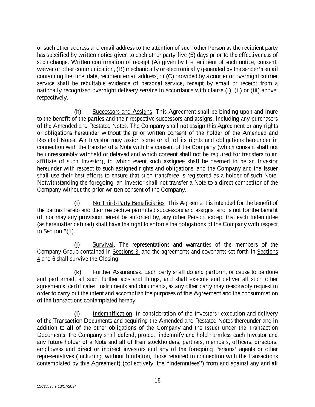 18 53093525.9 10/17/2024 or such other address and email address to the attention of such other Person as the recipient party has specified by written notice given to each other party five (5) days prior to the effectiveness of such change. Written confirmation of receipt (A) given by the recipient of such notice, consent, waiver or other communication, (B) mechanically or electronically generated by the sender’s email containing the time, date, recipient email address, or (C) provided by a courier or overnight courier service shall be rebuttable evidence of personal service, receipt by email or receipt from a nationally recognized overnight delivery service in accordance with clause (i), (ii) or (iii) above, respectively. (h) Successors and Assigns. This Agreement shall be binding upon and inure to the benefit of the parties and their respective successors and assigns, including any purchasers of the Amended and Restated Notes. The Company shall not assign this Agreement or any rights or obligations hereunder without the prior written consent of the holder of the Amended and Restated Notes. An Investor may assign some or all of its rights and obligations hereunder in connection with the transfer of a Note with the consent of the Company (which consent shall not be unreasonably withheld or delayed and which consent shall not be required for transfers to an affiliate of such Investor), in which event such assignee shall be deemed to be an Investor hereunder with respect to such assigned rights and obligations, and the Company and the Issuer shall use their best efforts to ensure that such transferee is registered as a holder of such Note. Notwithstanding the foregoing, an Investor shall not transfer a Note to a direct competitor of the Company without the prior written consent of the Company. (i) No Third-Party Beneficiaries. This Agreement is intended for the benefit of the parties hereto and their respective permitted successors and assigns, and is not for the benefit of, nor may any provision hereof be enforced by, any other Person, except that each Indemnitee (as hereinafter defined) shall have the right to enforce the obligations of the Company with respect to Section 6(1). (j) Survival. The representations and warranties of the members of the Company Group contained in Sections 3, and the agreements and covenants set forth in Sections 4 and 6 shall survive the Closing. (k) Further Assurances. Each party shall do and perform, or cause to be done and performed, all such further acts and things, and shall execute and deliver all such other agreements, certificates, instruments and documents, as any other party may reasonably request in order to carry out the intent and accomplish the purposes of this Agreement and the consummation of the transactions contemplated hereby. (l) Indemnification. In consideration of the Investors’ execution and delivery of the Transaction Documents and acquiring the Amended and Restated Notes thereunder and in addition to all of the other obligations of the Company and the Issuer under the Transaction Documents, the Company shall defend, protect, indemnify and hold harmless each Investor and any future holder of a Note and all of their stockholders, partners, members, officers, directors, employees and direct or indirect investors and any of the foregoing Persons’ agents or other representatives (including, without limitation, those retained in connection with the transactions contemplated by this Agreement) (collectively, the “Indemnitees”) from and against any and all