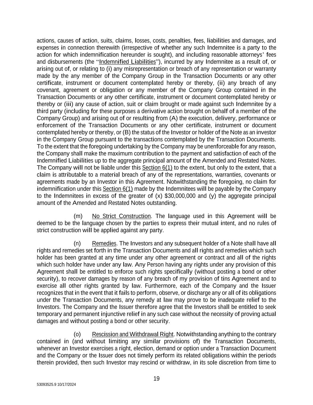 19 53093525.9 10/17/2024 actions, causes of action, suits, claims, losses, costs, penalties, fees, liabilities and damages, and expenses in connection therewith (irrespective of whether any such Indemnitee is a party to the action for which indemnification hereunder is sought), and including reasonable attorneys’ fees and disbursements (the “Indemnified Liabilities”), incurred by any Indemnitee as a result of, or arising out of, or relating to (i) any misrepresentation or breach of any representation or warranty made by the any member of the Company Group in the Transaction Documents or any other certificate, instrument or document contemplated hereby or thereby, (ii) any breach of any covenant, agreement or obligation or any member of the Company Group contained in the Transaction Documents or any other certificate, instrument or document contemplated hereby or thereby or (iii) any cause of action, suit or claim brought or made against such Indemnitee by a third party (including for these purposes a derivative action brought on behalf of a member of the Company Group) and arising out of or resulting from (A) the execution, delivery, performance or enforcement of the Transaction Documents or any other certificate, instrument or document contemplated hereby or thereby, or (B) the status of the Investor or holder of the Note as an investor in the Company Group pursuant to the transactions contemplated by the Transaction Documents. To the extent that the foregoing undertaking by the Company may be unenforceable for any reason, the Company shall make the maximum contribution to the payment and satisfaction of each of the Indemnified Liabilities up to the aggregate principal amount of the Amended and Restated Notes. The Company will not be liable under this Section 6(1) to the extent, but only to the extent, that a claim is attributable to a material breach of any of the representations, warranties, covenants or agreements made by an Investor in this Agreement. Notwithstanding the foregoing, no claim for indemnification under this Section 6(1) made by the Indemnitees will be payable by the Company to the Indemnitees in excess of the greater of (x) $30,000,000 and (y) the aggregate principal amount of the Amended and Restated Notes outstanding. (m) No Strict Construction. The language used in this Agreement will be deemed to be the language chosen by the parties to express their mutual intent, and no rules of strict construction will be applied against any party. (n) Remedies. The Investors and any subsequent holder of a Note shall have all rights and remedies set forth in the Transaction Documents and all rights and remedies which such holder has been granted at any time under any other agreement or contract and all of the rights which such holder have under any law. Any Person having any rights under any provision of this Agreement shall be entitled to enforce such rights specifically (without posting a bond or other security), to recover damages by reason of any breach of my provision of tins Agreement and to exercise all other rights granted by law. Furthermore, each of the Company and the Issuer recognizes that in the event that it fails to perform, observe, or discharge any or all of its obligations under the Transaction Documents, any remedy at law may prove to be inadequate relief to the Investors. The Company and the Issuer therefore agree that the Investors shall be entitled to seek temporary and permanent injunctive relief in any such case without the necessity of proving actual damages and without posting a bond or other security. (o) Rescission and Withdrawal Right. Notwithstanding anything to the contrary contained in (and without limiting any similar provisions of) the Transaction Documents, whenever an Investor exercises a right, election, demand or option under a Transaction Document and the Company or the Issuer does not timely perform its related obligations within the periods therein provided, then such Investor may rescind or withdraw, in its sole discretion from time to