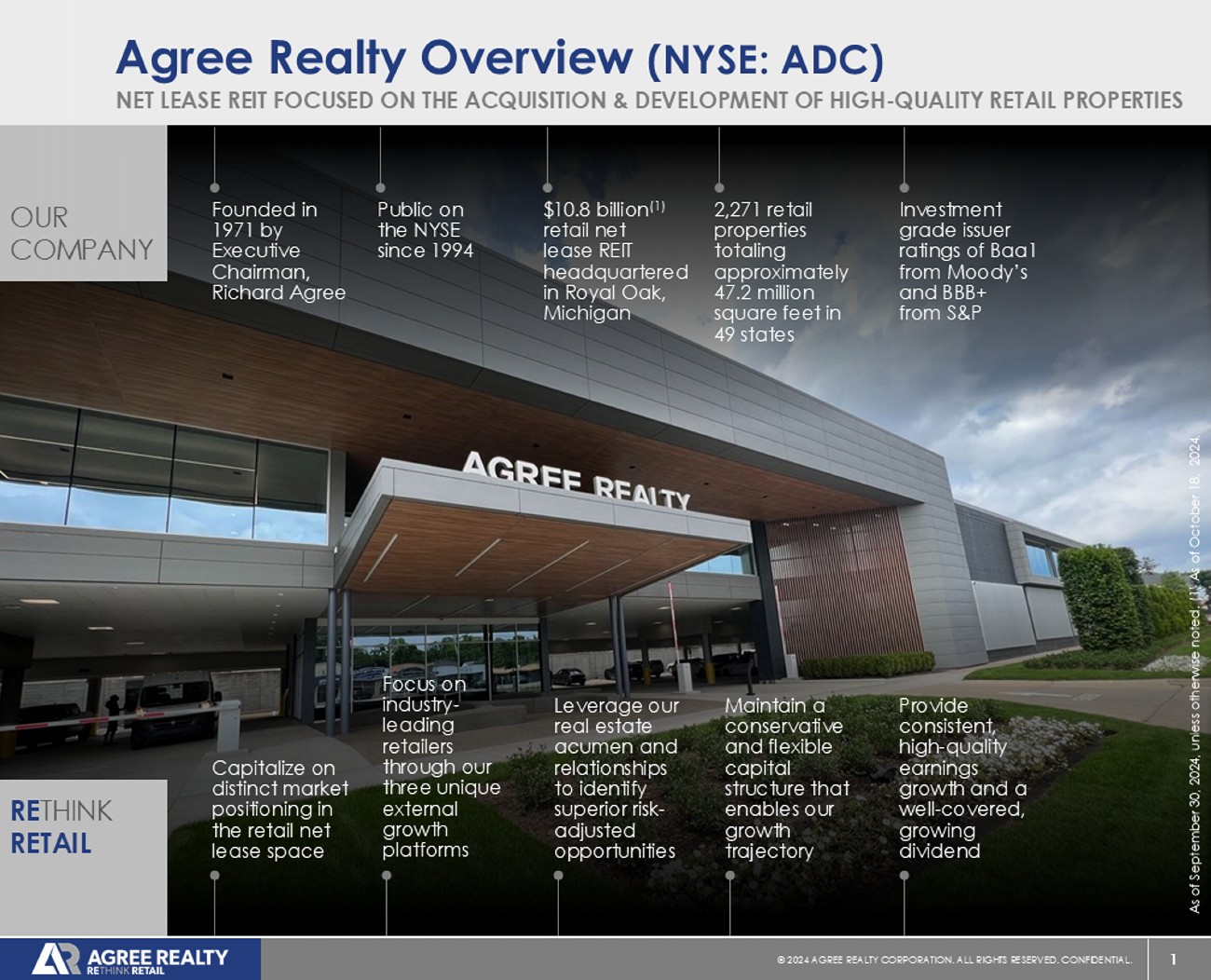 1 © 20 24 AGREE REALTY CORPORATION . ALL RIGHTS RESERVED. CONFIDENTIAL. Agree Realty Overview (NYSE: ADC) OUR COMPANY NET LEASE REIT FOCUSED ON THE ACQUISITION & DEVELOPMENT OF HIGH - QUALITY RETAIL PROPERTIES Founded in 1971 by Executive Chairman, Richard Agree Public on the NYSE since 1994 $ 10.8 billion (1) retail net lease REIT headquartered in Royal Oak, Michigan 2,271 retail properties totaling approximately 47.2 million square feet in 49 states Investment grade issuer ratings of Baa1 from Moody’s and BBB+ from S&P RE THINK RETAIL Capitalize on distinct market positioning in the retail net lease space Focus on industry - leading retailers through our three unique external growth platforms Leverage our real estate acumen and relationships to identify superior risk - adjusted opportunities Maintain a conservative and flexible capital structure that enables our growth trajectory Provide consistent, high - quality earnings growth and a well - covered, growing dividend As of September 30, 2024, unless otherwise noted. (1) As of October 18, 2024.