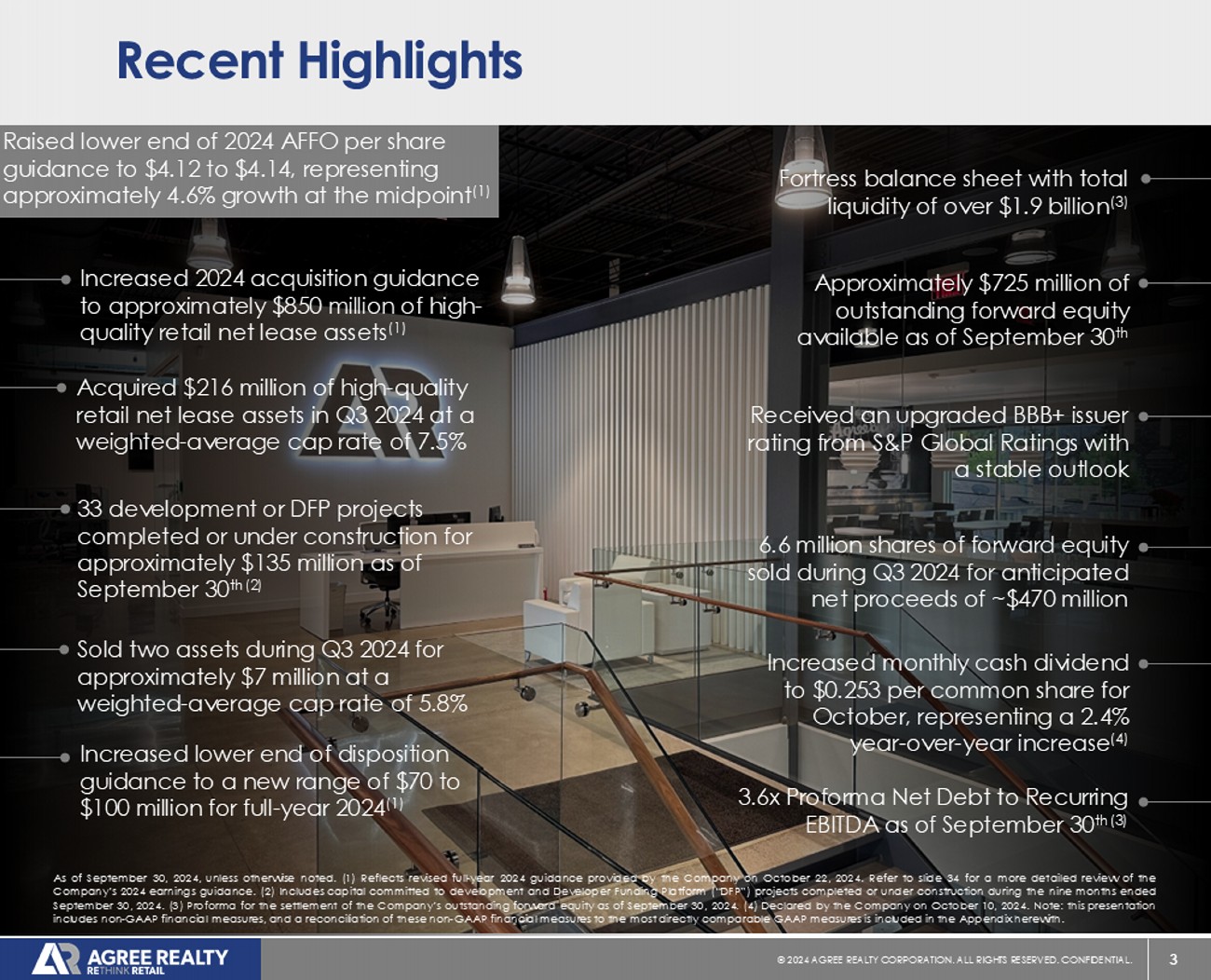3 © 20 24 AGREE REALTY CORPORATION . ALL RIGHTS RESERVED. CONFIDENTIAL. As of September 30 , 2024 , unless otherwise noted . ( 1 ) Reflects revised full - year 2024 guidance provided by the Company on October 22 , 2024 . Refer to slide 34 for a more detailed review of the Company’s 2024 earnings guidance . ( 2 ) Includes capital committed to development and Developer Funding Platform (“DFP”) projects completed or under construction during the nine months ended September 30 , 2024 . ( 3 ) Proforma for the settlement of the Company’s outstanding forward equity as of September 30 , 2024 . ( 4 ) Declared by the Company on October 10 , 2024 . Note : this presentation includes non - GAAP financial measures, and a reconciliation of these non - GAAP financial measures to the most directly comparable GAAP measures is included in the Appendix herewith . Recent Highlights Raised lower end of 2024 AFFO per share guidance to $4.12 to $4.14, representing approximately 4.6% growth at the midpoint (1) Acquired $216 million of high - quality retail net lease assets in Q3 2024 at a weighted - average cap rate of 7.5% Received an upgraded BBB+ issuer rating from S&P Global Ratings with a stable outlook 33 development or DFP projects completed or under construction for approximately $135 million as of September 30 th(2) Fortress balance sheet with total liquidity of over $1.9 billion (3) Increased 2024 acquisition guidance to approximately $850 million of high - quality retail net lease assets (1) Increased lower end of disposition guidance to a new range of $70 to $100 million for full - year 2024 (1) Increased monthly cash dividend to $ 0.253 per common share for October , representing a 2.4 % year - over - year increase (4) Sold two assets during Q3 2024 for approximately $7 million at a weighted - average cap rate of 5.8% 6.6 million shares of forward equity sold during Q3 2024 for anticipated net proceeds of ~$470 million 3 .6x Proforma Net Debt to Recurring EBITDA as of September 30 th(3 ) Approximately $725 million of outstanding forward equity available as of September 30 th