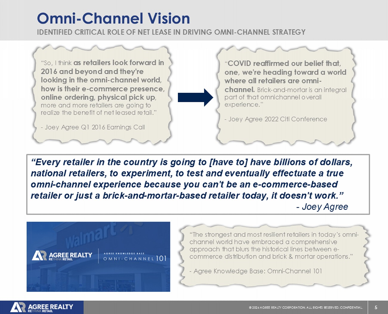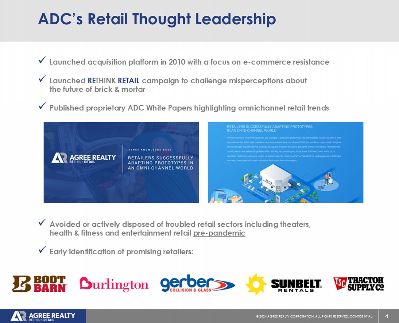4 © 20 24 AGREE REALTY CORPORATION . ALL RIGHTS RESERVED. CONFIDENTIAL. ADC’s Retail Thought Leadership x Launched acquisition platform in 2010 with a focus on e - commerce resistance x Launched RE THINK RETAIL campaign to challenge misperceptions about the future of brick & mortar x Published proprietary ADC White Papers highlighting omnichannel retail trends x Avoided or actively disposed of troubled retail sectors including theaters, health & fitness and entertainment retail pre - pandemic x Early identification of promising retailers: