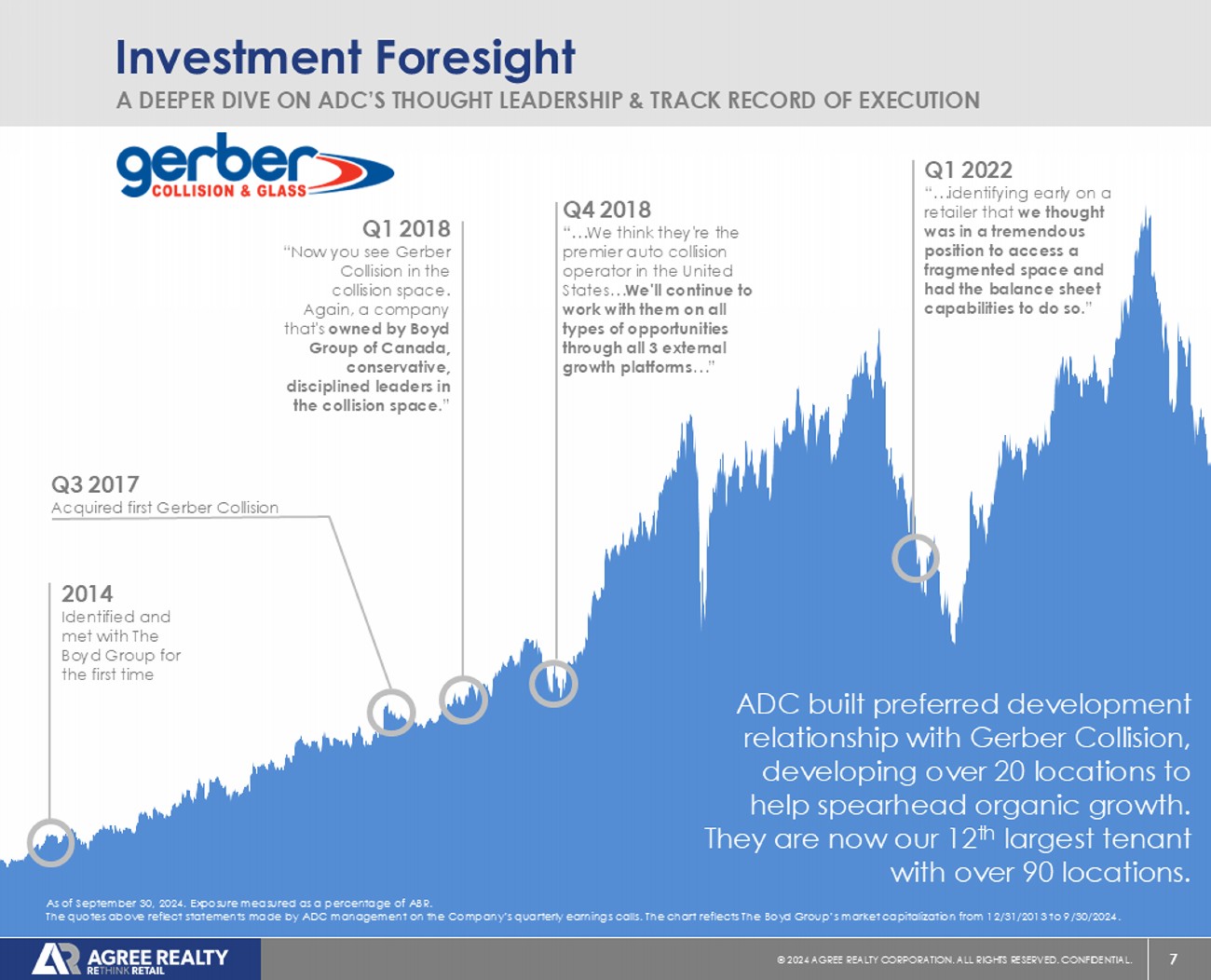 6 © 20 24 AGREE REALTY CORPORATION . ALL RIGHTS RESERVED. CONFIDENTIAL. October 2020 Rated BBB by S&P Rated Baa1 by Moody’s Q 2 2016 “While neither Tractor Supply Company nor Hobby Lobby maintains a public credit rating, both possess investment - grade quality financials with very strong balance sheets .” Q1 2017 “…it's a great company, it's got a fantastic balance sheet. …and we have a great relationship and respect for them.” Q3 2018 “ We have a fantastic relationship with their real estate team. The business is really thriving. They have no national competition. They also have the highest - rated e - commerce website of any retailer.” Investment Foresight A DEEPER DIVE ON ADC’S THOUGHT LEADERSHIP & TRACK RECORD OF EXECUTION As of September 30, 2024. Exposure measured as a percentage of ABR. The quotes above reflect statements made by ADC management on the Company’s quarterly earnings calls. The chart reflects Trac tor Supply’s market capitalization from 12/31/2012 to 9/30/2024. ADC has acquired over 100 locations since 2013 and today TSCO is our 2 nd largest tenant. Q3 2013 Acquired first Tractor Supply