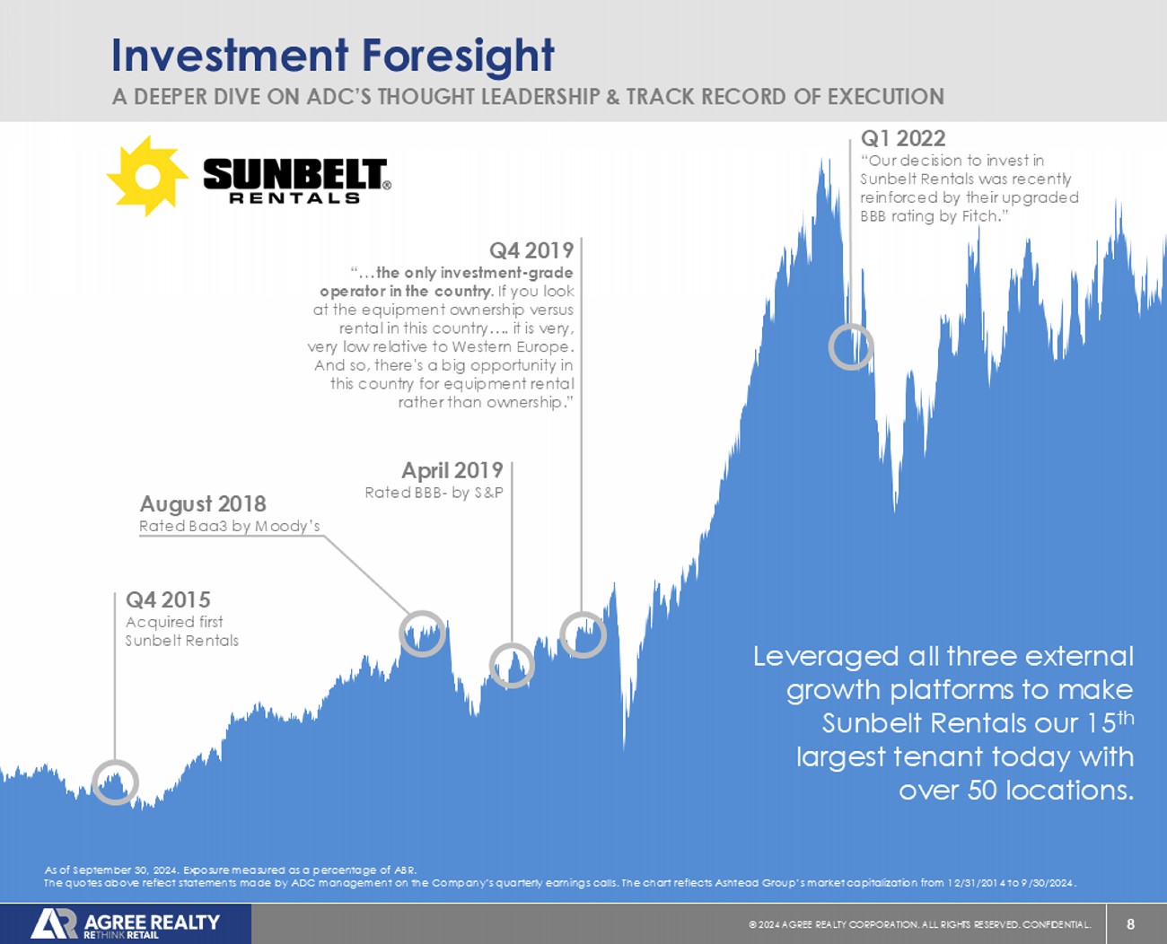 7 © 20 24 AGREE REALTY CORPORATION . ALL RIGHTS RESERVED. CONFIDENTIAL. Investment Foresight A DEEPER DIVE ON ADC’S THOUGHT LEADERSHIP & TRACK RECORD OF EXECUTION Q3 2017 Acquired first Gerber Collision Q4 2018 “…We think they're the premier auto collision operator in the United States… We'll continue to work with them on all types of opportunities through all 3 external growth platforms …” Q1 2022 “…identifying early on a retailer that we thought was in a tremendous position to access a fragmented space and had the balance sheet capabilities to do so .” ADC built preferred development relationship with Gerber Collision, developing over 20 locations to help spearhead organic growth. They are now our 12 th largest tenant with over 90 locations. As of September 30, 2024. Exposure measured as a percentage of ABR. The quotes above reflect statements made by ADC management on the Company’s quarterly earnings calls. The chart reflects The Boy d Group’s market capitalization from 12/31/2013 to 9/30/2024. Q1 2018 “Now you see Gerber Collision in the collision space. Again, a company that's owned by Boyd Group of Canada, conservative, disciplined leaders in the collision space .” 2014 Identified and met with The Boyd Group for the first time