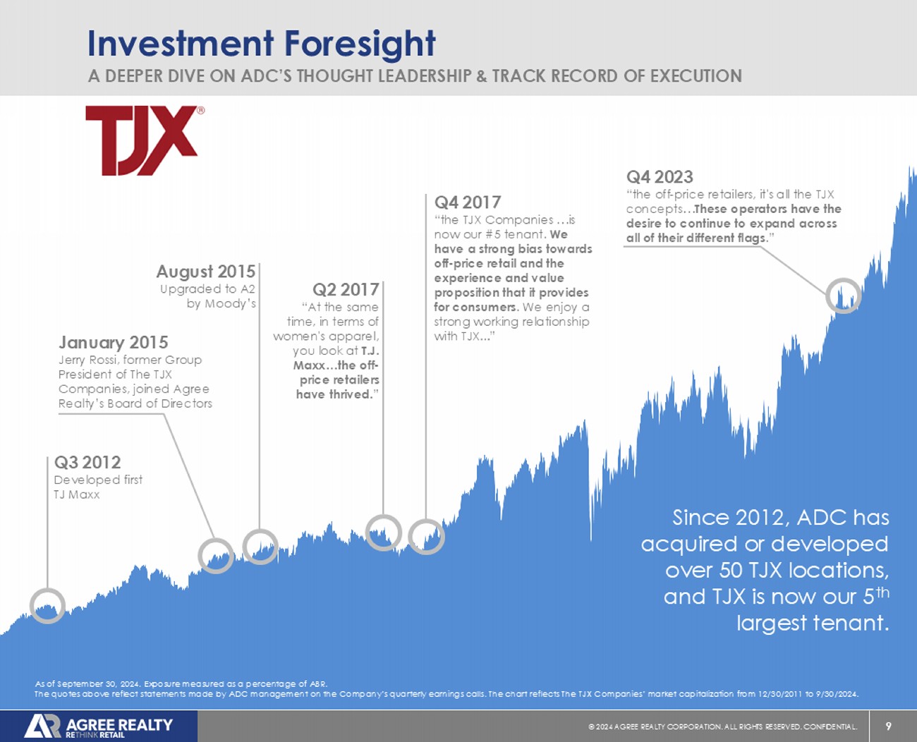 8 © 20 24 AGREE REALTY CORPORATION . ALL RIGHTS RESERVED. CONFIDENTIAL. Investment Foresight A DEEPER DIVE ON ADC’S THOUGHT LEADERSHIP & TRACK RECORD OF EXECUTION Leveraged all three external growth platforms to make Sunbelt Rentals our 15 th largest tenant today with over 50 locations. As of September 30, 2024. Exposure measured as a percentage of ABR. The quotes above reflect statements made by ADC management on the Company’s quarterly earnings calls. The chart reflects Asht ead Group’s market capitalization from 12/31/2014 to 9/30/2024. Q4 2015 Acquired first Sunbelt Rentals Q4 2019 “… the only investment - grade operator in the country . If you look at the equipment ownership versus rental in this country…. it is very, very low relative to Western Europe. And so, there's a big opportunity in this country for equipment rental rather than ownership.” April 2019 Rated BBB - by S&P August 2018 Rated Baa3 by Moody’s Q1 2022 “Our decision to invest in Sunbelt Rentals was recently reinforced by their upgraded BBB rating by Fitch.”