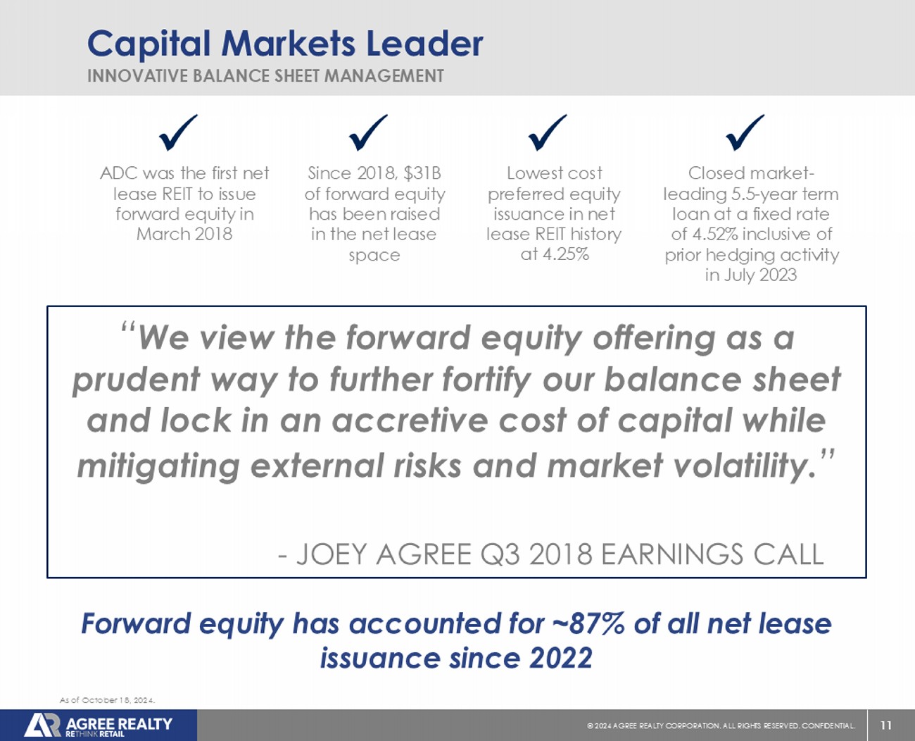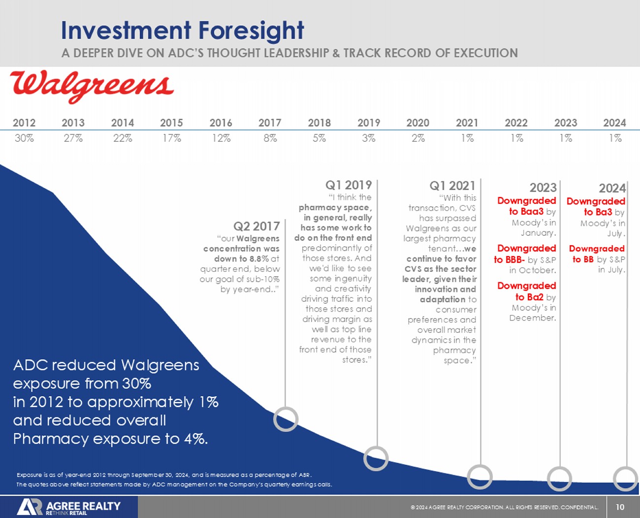 10 © 20 24 AGREE REALTY CORPORATION . ALL RIGHTS RESERVED. CONFIDENTIAL. Investment Foresight A DEEPER DIVE ON ADC’S THOUGHT LEADERSHIP & TRACK RECORD OF EXECUTION 2024 2023 2022 2021 2020 2019 2018 2017 2016 2015 2014 2013 2012 1% 1% 1% 1% 2% 3% 5% 8% 12% 17% 22% 27% 30% Q2 2017 “our Walgreens concentration was down to 8.8% at quarter end, below our goal of sub - 10% by year - end..” Q1 2021 “With this transaction, CVS has surpassed Walgreens as our largest pharmacy tenant… we continue to favor CVS as the sector leader, given their innovation and adaptation to consumer preferences and overall market dynamics in the pharmacy space.” Q1 2019 “ I think the pharmacy space, in general, really has some work to do on the front end predominantly of those stores. And we'd like to see some ingenuity and creativity driving traffic into those stores and driving margin as well as top line revenue to the front end of those stores.” ADC reduced Walgreens exposure from 30% in 2012 to approximately 1% and reduced overall Pharmacy exposure to 4%. Exposure is as of year - end 2012 through September 30, 2024, and is measured as a percentage of ABR. The quotes above reflect statements made by ADC management on the Company’s quarterly earnings calls. 2023 Downgraded to Baa3 by Moody’s in January. Downgraded to BBB - by S&P in October. Downgraded to Ba2 by Moody’s in December. 2024 Downgraded to Ba3 by Moody’s in July. Downgraded to BB by S&P in July.