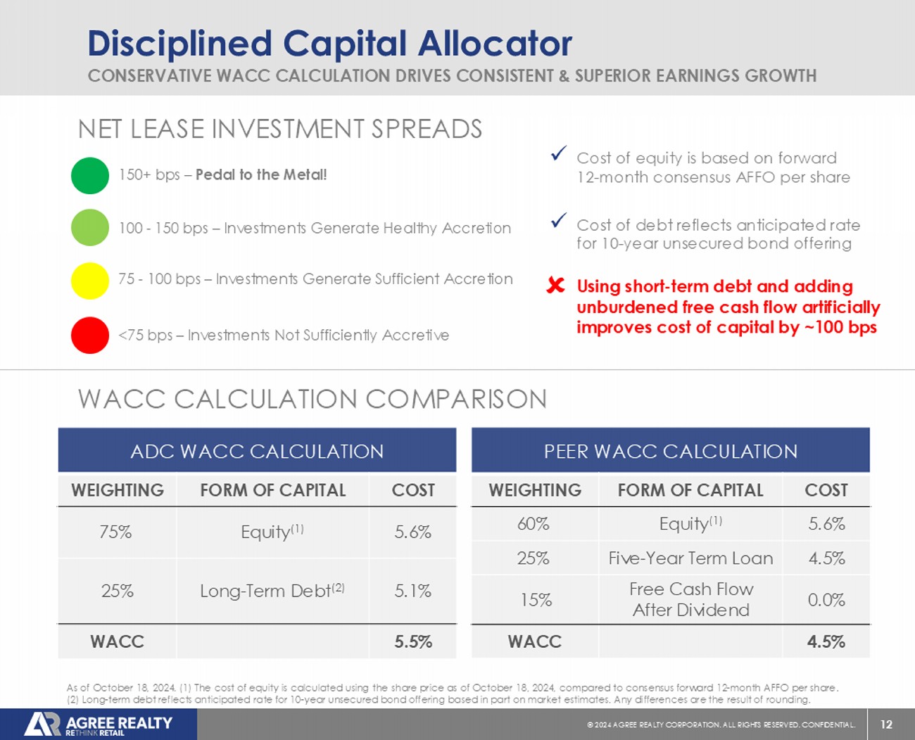 11 © 20 24 AGREE REALTY CORPORATION . ALL RIGHTS RESERVED. CONFIDENTIAL. Capital Markets Leader INNOVATIVE BALANCE SHEET MANAGEMENT “ We view the forward equity offering as a prudent way to further fortify our balance sheet and lock in an accretive cost of capital while mitigating external risks and market volatility. ” - JOEY AGREE Q3 2018 EARNINGS CALL x A ADC was the first net lease REIT to issue forward equity in March 2018 x A Since 2018, $31B of forward equity has been raised in the net lease space x A Lowest cost preferred equity issuance in net lease REIT history at 4.25% x A Closed market - leading 5.5 - year term loan at a fixed rate of 4.52% inclusive of prior hedging activity in July 2023 Forward equity has accounted for ~87% of all net lease issuance since 2022 As of October 18, 2024.