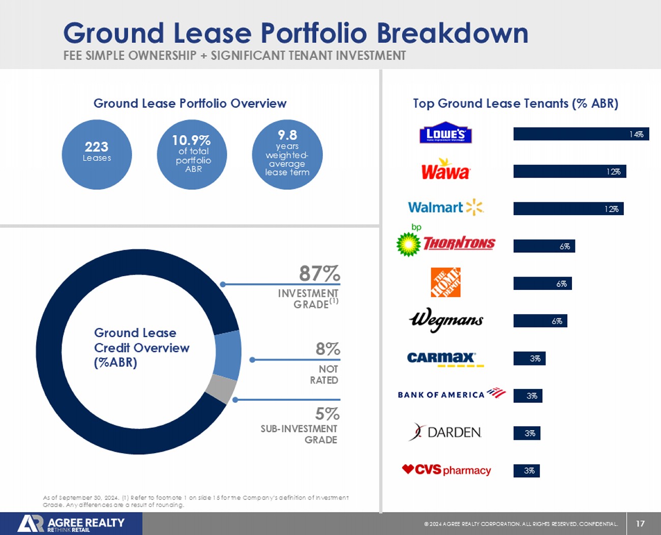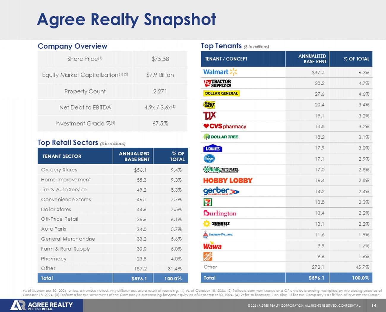 As of September 30, 2024, the Company’s portfolio consisted of 2,271 properties located in 49 states and contained approximately 47.2 million square feet of gross leasable area. At quarter end, the portfolio was 99.6% leased, had a weighted-average remaining lease term of approximately 7.9 years, and generated 67.5% of annualized base rents from investment grade retail tenants.