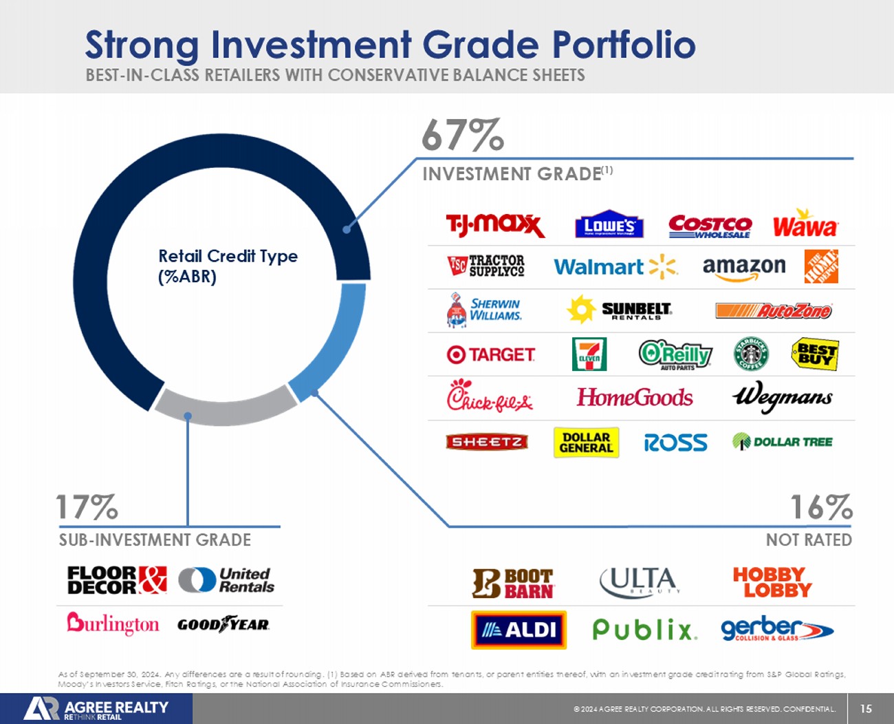 14 © 20 24 AGREE REALTY CORPORATION . ALL RIGHTS RESERVED. CONFIDENTIAL. % OF TOTAL ANNUALIZED BASE RENT TENANT / CONCEPT 6.3% $37.7 4.7% 28.2 4.6% 27.6 3.4% 20.4 3.2% 19.1 3.2% 18.8 3.1% 18.2 3.0% 17.9 2.9% 17.1 2.8% 17.0 2.8% 16.4 2.4% 14.2 2.3% 13.8 2.2% 13.4 2.2% 13.1 1.9% 11.6 1.7% 9.9 1.6% 9.6 45.7% 272.1 Other 100.0% $596.1 Total Agree Realty Snapshot % OF TOTAL ANNUALIZED BASE RENT TENANT SECTOR 9.4% $56.1 Grocery Stores 9.3% 55.3 Home Improvement 8.3% 49.2 Tire & Auto Service 7.7% 46.1 Convenience Stores 7.5% 44.6 Dollar Stores 6.1% 36.6 Off - Price Retail 5.7% 34.0 Auto Parts 5.6% 33.2 General Merchandise 5.0% 30.0 Farm & Rural Supply 4.0% 23.8 Pharmacy 31.4% 187.2 Other 100.0% $596.1 Total $75.58 Share Price (1) $7.9 Billion Equity Market Capitalization (1)(2) 2,271 Property Count 4.9x / 3.6x (3) Net Debt to EBITDA 67.5% Investment Grade % (4) Company Overview Top Tenants ($ in millions) Top Retail Sectors ($ in millions) As of September 30, 2024, unless otherwise noted. Any differences are a result of rounding. (1) As of October 18, 2024. (2) R efl ects common shares and OP units outstanding multiplied by the closing price as of October 18, 2024. (3) Proforma for the settlement of the Company’s outstanding forward equity as of September 30, 2024. (4) R efe r to footnote 1 on slide 15 for the Company’s definition of Investment Grade.