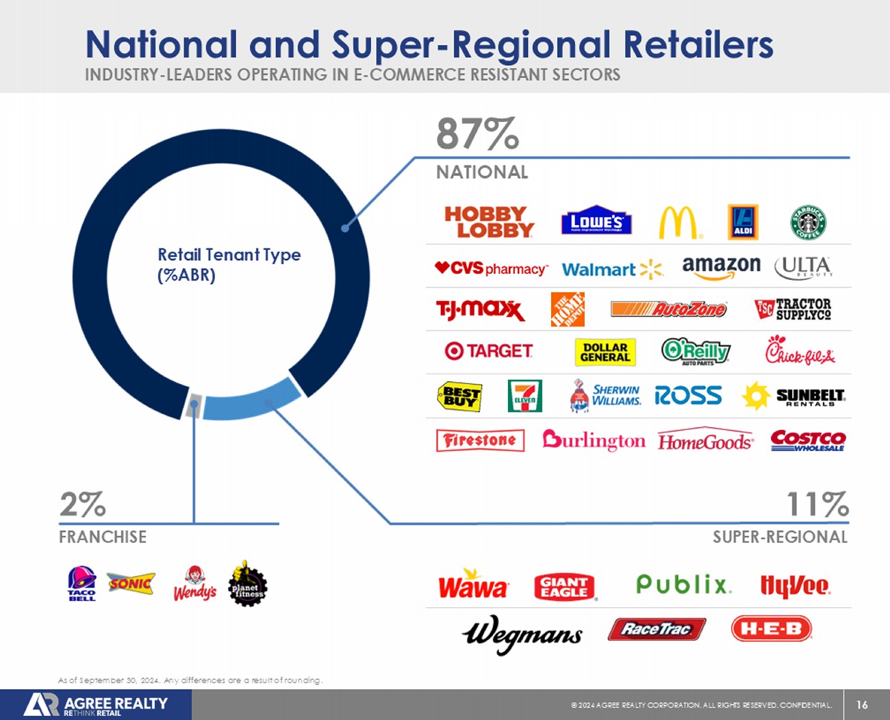 15 © 20 24 AGREE REALTY CORPORATION . ALL RIGHTS RESERVED. CONFIDENTIAL. BEST - IN - CLASS RETAILERS WITH CONSERVATIVE BALANCE SHEETS Strong Investment Grade Portfolio 17% SUB - INVESTMENT GRADE 16% NOT RATED 67% INVESTMENT GRADE (1) As of September 30, 2024. Any differences are a result of rounding. (1) Based on ABR derived from tenants, or parent entities th ereof, with an investment grade credit rating from S&P Global Ratings, Moody’s Investors Service, Fitch Ratings, or the National Association of Insurance Commissioners. Retail Credit Type (%ABR)