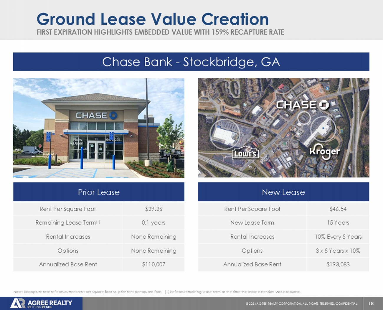 17 © 20 24 AGREE REALTY CORPORATION . ALL RIGHTS RESERVED. CONFIDENTIAL. 14% 12% 12% 6% 6% 6% 3% 3% 3% 3% As of September 30, 2024. (1) Refer to footnote 1 on slide 15 for the Company’s definition of Investment Grade. Any differences are a result of rounding. FEE SIMPLE OWNERSHIP + SIGNIFICANT TENANT INVESTMENT Ground Lease Portfolio Breakdown Ground Lease Credit Overview (%ABR) 87% INVESTMENT GRADE (1) 8% NOT RATED 5% SUB - INVESTMENT GRADE Ground Lease Portfolio Overview 223 Leases 10.9% of total portfolio ABR 9.8 years weighted - average lease term Top Ground Lease Tenants (% ABR)