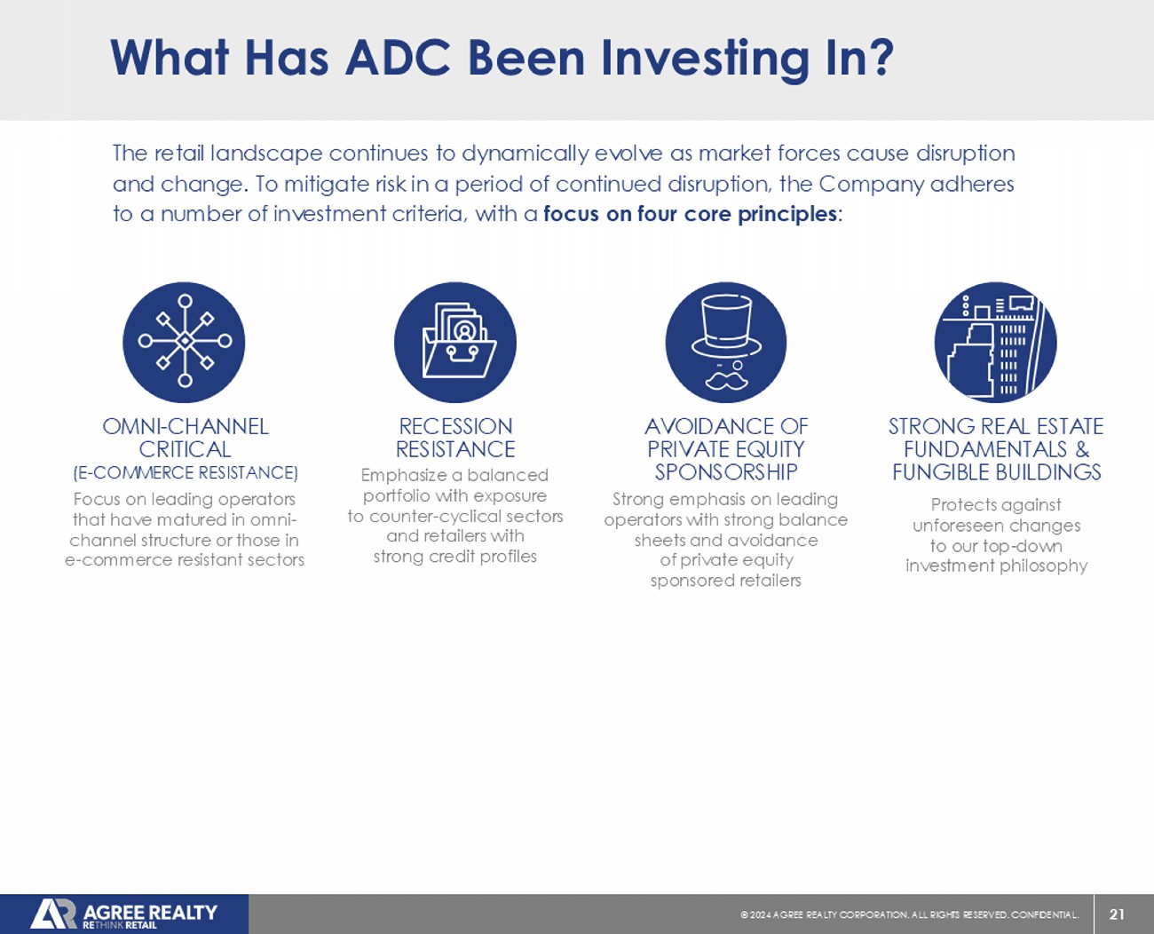 20 © 20 24 AGREE REALTY CORPORATION . ALL RIGHTS RESERVED. CONFIDENTIAL. Engage in consistent dialogue to understand store performance and tenant sustainability Leverage relationships to identify the best risk - adjusted opportunities Our Investment Strategy Agree leverages its three distinct investment platforms to target industry - leading retailers in e - commerce and recession resistant sectors THREE - PRONGED GROWTH STRATEGY COMPREHENSIVE REAL ESTATE SOLUTIONS FOR LEADING RETAILERS ACQUISITIONS DEVELOPMENT DEVELOPER FUNDING PLATFORM RETAILER RELATIONSHIPS