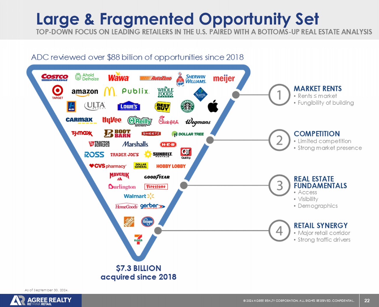 21 © 20 24 AGREE REALTY CORPORATION . ALL RIGHTS RESERVED. CONFIDENTIAL. What Has ADC Been Investing In? The retail landscape continues to dynamically evolve as market forces cause disruption and change. To mitigate risk in a period of continued disruption, the Company adheres to a number of investment criteria, with a focus on four core principles : Focus on leading operators that have matured in omni - channel structure or those in e - commerce resistant sectors OMNI - CHANNEL CRITICAL (E - COMMERCE RESISTANCE) Emphasize a balanced portfolio with exposure to counter - cyclical sectors and retailers with strong credit profiles RECESSION RESISTANCE Strong emphasis on leading operators with strong balance sheets and avoidance of private equity sponsored retailers AVOIDANCE OF PRIVATE EQUITY SPONSORSHIP Protects against unforeseen changes to our top - down investment philosophy STRONG REAL ESTATE FUNDAMENTALS & FUNGIBLE BUILDINGS