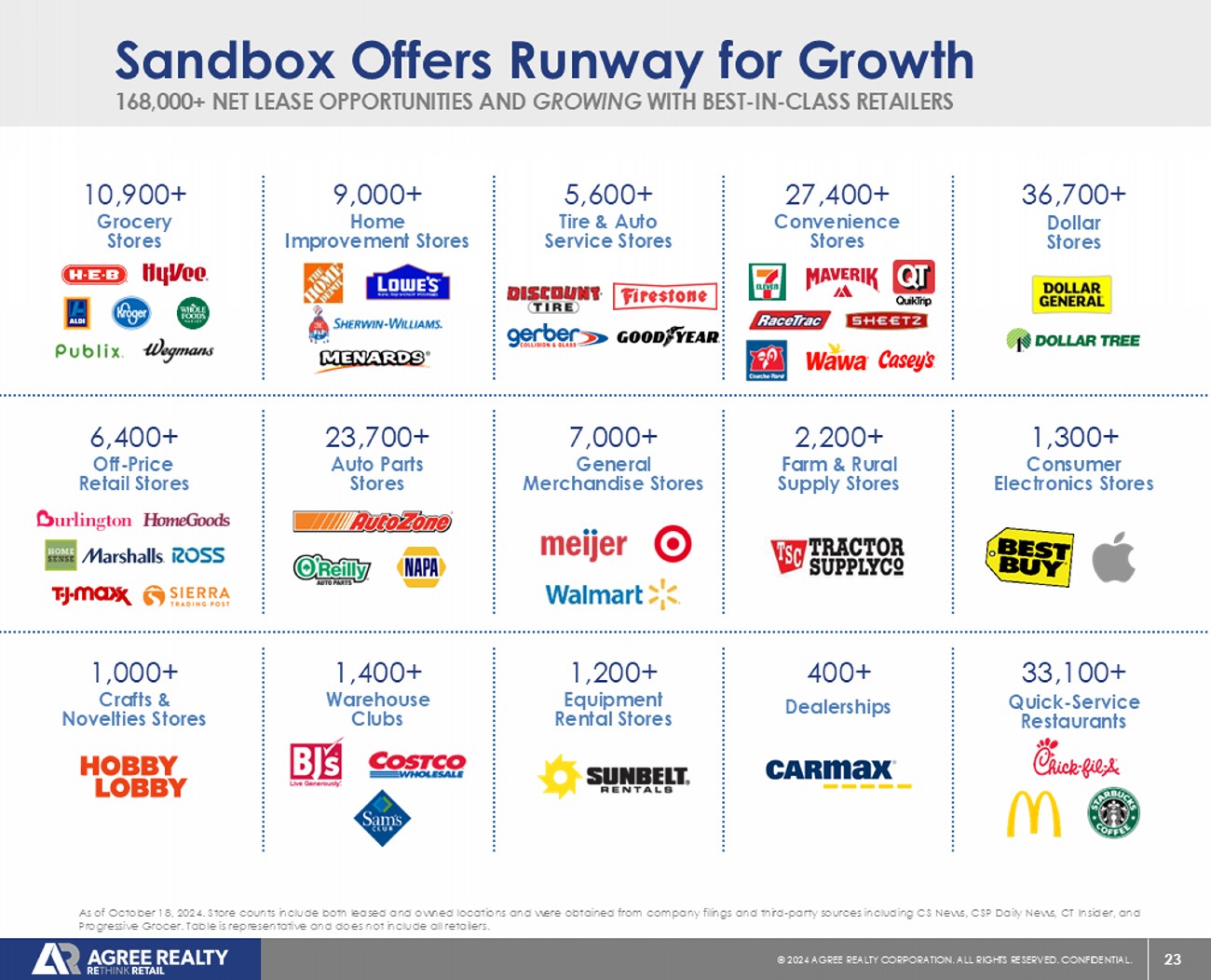 23 © 20 24 AGREE REALTY CORPORATION . ALL RIGHTS RESERVED. CONFIDENTIAL. As of October 18, 2024. Store counts include both leased and owned locations and were obtained from company filings and third - pa rty sources including CS News, CSP Daily News, CT Insider, and Progressive Grocer. Table is representative and does not include all retailers. 168,000+ NET LEASE OPPORTUNITIES AND GROWING WITH BEST - IN - CLASS RETAILERS Sandbox Offers Runway for Growth Auto Parts Stores 23,700+ Farm & Rural Supply Stores 2,200+ Crafts & Novelties Stores 1,000+ Quick - Service Restaurants 33,100+ Equipment Rental Stores 1,200+ Warehouse Clubs 1,400+ Home Improvement Stores 9,000+ Consumer Electronics Stores 1,300+ Grocery Stores 10,900+ Dealerships 400+ Convenience Stores 27,400+ Off - Price Retail Stores 6,400+ Tire & Auto Service Stores 5,600+ Dollar Stores 36,700+ General Merchandise Stores 7,000+