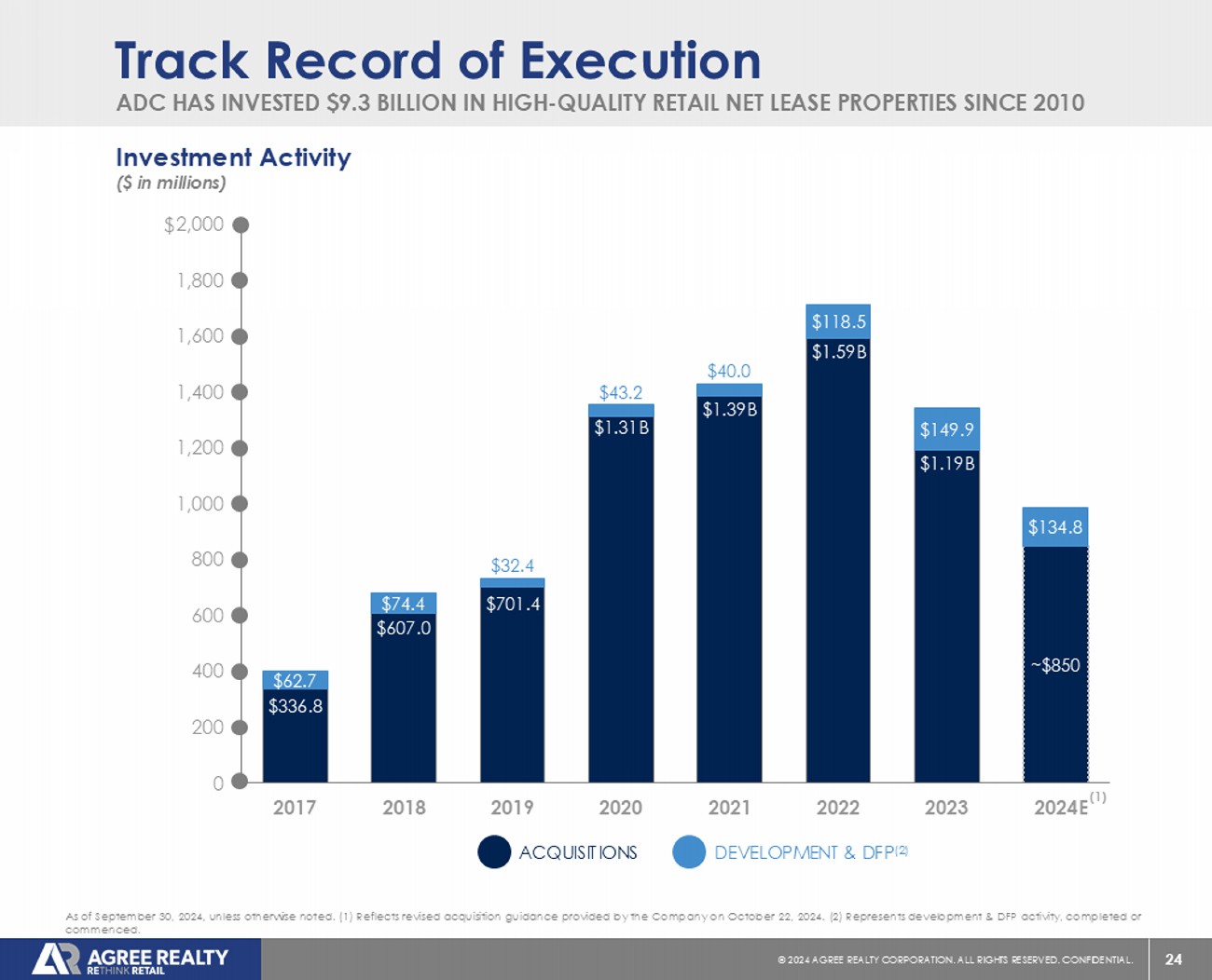 "We are very pleased with our year-to-date performance as we have accelerated investment activity while strengthening our balance sheet through proactive capital markets transactions," said Joey Agree, President and Chief Executive Officer. "During the quarter, we raised nearly $470 million of forward equity, contributing to record liquidity of over $1.9 billion. Given the continued strong performance of our portfolio and accelerating investment activity across all three external growth platforms, we are increasing full-year 2024 acquisition guidance to approximately $850 million and raising the lower end of our 2024 AFFO per share guidance to a range of $4.12 to $4.14.”