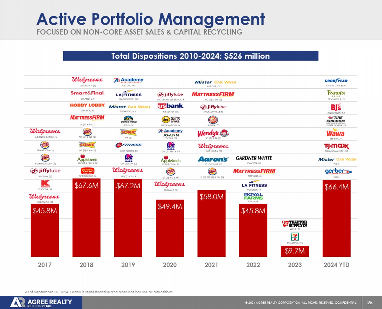 25 © 20 24 AGREE REALTY CORPORATION . ALL RIGHTS RESERVED. CONFIDENTIAL. $45.8M $67.6M $67.2M $49.4M $58.0M $45.8M $9.7M $66.4M 2017 2018 2019 2020 2021 2022 2023 2024 YTD BERLIN, NJ HOUSTON, TX PORTAGE, MI CANTON, MI FOCUSED ON NON - CORE ASSET SALES & CAPITAL RECYCLING Active Portfolio Management As of September 30, 2024. Graph is representative and does not include all dispositions. Total Dispositions 2010 - 2024: $526 million STALLINGS, NC MICHIGAN (3) OSCODA, MI FLORIDA (2) NORTH DAKOTA (3) MINNESOTA (3) ATLANTIC BEACH, FL MT (1) & VA (1) WICHITA FALLS, TX SPRINGFIELD, IL UPLAND, CA APOPKA, FL LA (1) & PA (1) MN (2) & ND (2) MICHIGAN (3) FORT WORTH, TX OH (2) & PA (2) FLOWOOD, MS MAPLEWOOD, MN TYLER, TX BELTON, MO MI (2), NY & FL VA (3) MIDLAND, MI UT (2), ND & MT PENSACOLA, FL OH (3), WV, & VA TOPEKA, KS INDIANAPOLIS, IN KIRKLAND, WA JACKSONVILLE BEACH, FL IL (1), ND (1) & OH (1) MICHIGAN (2) ST. GEORGE, UT SC (2) & TX (1) AUSTIN, TX JACKSONVILLE, FL SC (1) & MN (1) AURORA, CO WYLIE, TX FL (5) FL (2) PUNTA GORDA , FL ALLENTOWN, PA PENSACOLA, FL CORAL GABLES, FL OKLAHOMA CITY, OK SEBRING, FL