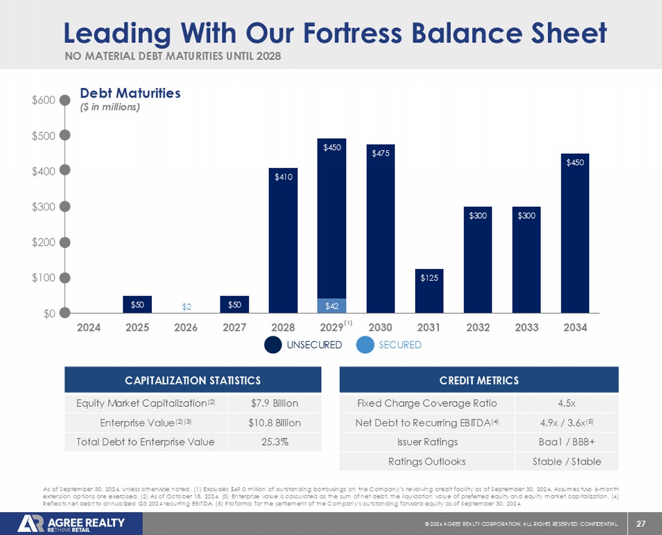 27 © 20 24 AGREE REALTY CORPORATION . ALL RIGHTS RESERVED. CONFIDENTIAL. $2 $42 $0 $50 $0 $50 $410 $450 $475 $125 $300 $300 $450 $0 $100 $200 $300 $400 $500 $600 2024 2025 2026 2027 2028 2029 2030 2031 2032 2033 2034 Leading With Our Fortress Balance Sheet CAPITALIZATION STATISTICS $7.9 Billion Equity Market Capitalization (2) $10.8 Billion Enterprise Value (2)(3) 25.3% Total Debt to Enterprise Value CREDIT METRICS 4.5x Fixed Charge Coverage Ratio 4.9x / 3.6x (5) Net Debt to Recurring EBITDA (4) Baa1 / BBB+ Issuer Ratings Stable / Stable Ratings Outlooks As of September 30 , 2024 , unless otherwise noted . ( 1 ) Excludes $ 49 . 0 million of outstanding borrowings on the Company’s revolving credit facility as of September 30 , 2024 . Assumes two 6 - month extension options are exercised . ( 2 ) As of October 18 , 2024 . ( 3 ) Enterprise value is calculated as the sum of net debt, the liquidation value of preferred equity and equity market capitalization . ( 4 ) Reflects net debt to annualized Q 3 2024 recurring EBITDA . ( 5 ) Proforma for the settlement of the Company's outstanding forward equity as of September 30 , 2024 . Debt Maturities ($ in millions) SECURED UNSECURED NO MATERIAL DEBT MATURITIES UNTIL 2028 (1)