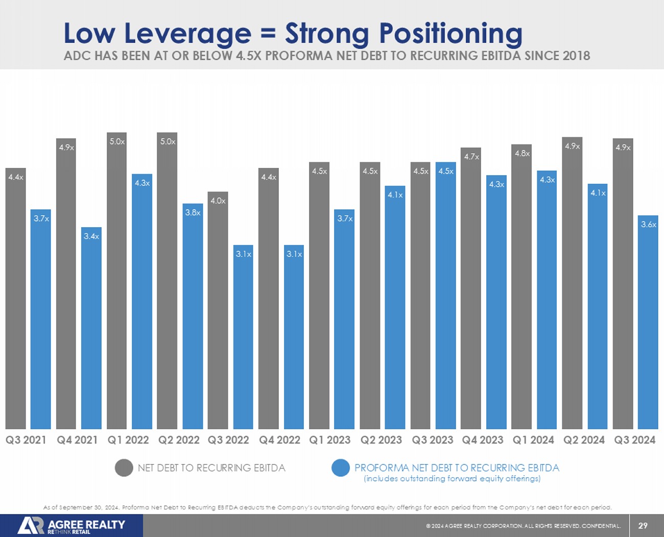 29 © 20 24 AGREE REALTY CORPORATION . ALL RIGHTS RESERVED. CONFIDENTIAL. (includes outstanding forward equity offerings) ADC HAS BEEN AT OR BELOW 4.5X PROFORMA NET DEBT TO RECURRING EBITDA SINCE 2018 Low Leverage = Strong Positioning As of September 30, 2024. Proforma Net Debt to Recurring EBITDA deducts the Company’s outstanding forward equity offerings fo r e ach period from the Company’s net debt for each period. PROFORMA NET DEBT TO RECURRING EBITDA NET DEBT TO RECURRING EBITDA Q1 2024 Q2 2024 Q3 2024 Q4 2021 Q1 2022 Q2 2022 Q3 2022 Q4 2022 Q1 2023 Q2 2023 Q3 2023 Q4 2023 Q3 2021 4.4x 3.7x 4.9x 3.4x 5.0x 4.3x 5.0x 3.8x 4.0x 3.1x 4.4x 3.1x 4.5x 3.7x 4.5x 4.1x 4.5x 4.5x 4.7x 4.3x 4.8x 4.3x 4.9x 4.1x 4.9x 3.6x