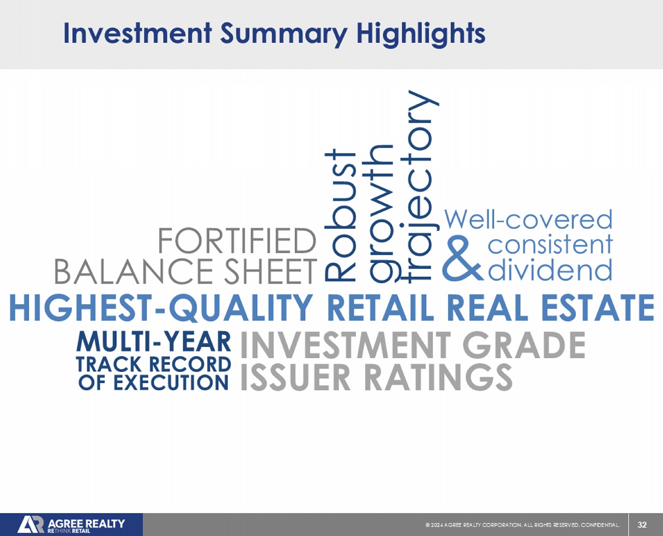 32 © 20 24 AGREE REALTY CORPORATION . ALL RIGHTS RESERVED. CONFIDENTIAL. Investment Summary Highlights FORTIFIED BALANCE SHEET HIGHEST - QUALITY RETAIL REAL ESTATE INVESTMENT GRADE ISSUER RATINGS Robust growth trajectory MULTI - YEAR TRACK RECORD OF EXECUTION Well - covered & consistent dividend