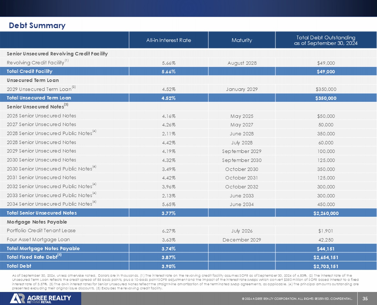 35 © 20 24 AGREE REALTY CORPORATION . ALL RIGHTS RESERVED. CONFIDENTIAL. Debt Summary Total Debt Outstanding as of September 30, 2024 Maturity All - in Interest Rate Senior Unsecured Revolving Credit Facility $49,000 August 2028 5.66% Revolving Credit Facility (1) $49,000 5.66% Total Credit Facility Unsecured Term Loan $350,000 January 2029 4.52% 2029 Unsecured Term Loan (2) $350,000 4.52% Total Unsecured Term Loan Senior Unsecured Notes (3) $50,000 May 2025 4.16% 2025 Senior Unsecured Notes 50,000 May 2027 4.26% 2027 Senior Unsecured Notes 350,000 June 2028 2.11% 2028 Senior Unsecured Public Notes (4) 60,000 July 2028 4.42% 2028 Senior Unsecured Notes 100,000 September 2029 4.19% 2029 Senior Unsecured Notes 125,000 September 2030 4.32% 2030 Senior Unsecured Notes 350,000 October 2030 3.49% 2030 Senior Unsecured Public Notes (4) 125,000 October 2031 4.42% 2031 Senior Unsecured Notes 300,000 October 2032 3.96% 2032 Senior Unsecured Public Notes (4) 300,000 June 2033 2.13% 2033 Senior Unsecured Public Notes (4) 450,000 June 2034 5.65% 2034 Senior Unsecured Public Notes (4) $2,260,000 3.77% Total Senior Unsecured Notes Mortgage Notes Payable $1,901 July 2026 6.27% Portfolio Credit Tenant Lease 42,250 December 2029 3.63% Four Asset Mortgage Loan $44,151 3.74% Total Mortgage Notes Payable $2,654,151 3.87% Total Fixed Rate Debt (5) $2,703,151 3.90% Total Debt As of September 30, 2024, unless otherwise noted. Dollars are in thousands. (1) The interest rate on the revolving credit fa cil ity assumes SOFR as of September 30, 2024 of 4.83%. (2) The interest rate of the Unsecured Term Loan reflects the credit spread of 85 basis points, plus a 10 - basis point SOFR adjustment and the impact of the i nterest rate swaps which convert $350 million of SOFR based interest to a fixed interest rate of 3.57%. (3) The all - in interest rates for Senior Unsecured Notes reflect the straight - line amortization of the t erminated swap agreements, as applicable. (4) The principal amounts outstanding are presented excluding their original issue discounts. (5) Excludes the revolving credit facility.