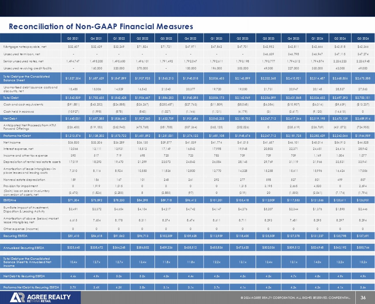 36 © 20 24 AGREE REALTY CORPORATION . ALL RIGHTS RESERVED. CONFIDENTIAL. Reconciliation of Non - GAAP Financial Measures Q3 2024 Q2 2024 Q1 2024 Q4 2023 Q3 2023 Q2 2023 Q1 2023 Q4 2022 Q3 2022 Q2 2022 Q1 2022 Q4 2021 Q3 2021 $42,366 $42,518 $42,666 $42,811 $42,952 $47,701 $47,842 $47,971 $71,721 $71,824 $32,249 $32,429 $32,607 Mortgage notes payable, net 347,274 347,115 346,947 346,798 346,639 - - - - - - - - Unsecured term loan, net 2,236,948 2,236,223 1,794,874 1,794,312 1,793,777 1,793,198 1,792,611 1,792,047 1,791,492 1,496,101 1,495,650 1,495,200 1,494,747 Senior unsecured notes, net 49,000 43,000 330,000 227,000 49,000 303,000 196,000 100,000 - 370,000 320,000 160,000 - Unsecured revolving credit facility $2,675,588 $2,668,856 $2,514,487 $2,410,921 $2,232,368 $2,143,899 $2,036,453 $1,940,018 $1,863,213 $1,937,925 $1,847,899 $1,687,629 $1,527,354 Total Debt per the Consolidated Balance Sheet 27,563 28,537 20,145 20,947 21,731 19,050 19,720 20,377 21,040 16,542 14,529 15,006 15,485 Unamortized debt issuance costs and discounts, net $2,703,151 $2,697,393 $2,534,632 $2,431,868 $2,254,099 $2,162,949 $2,056,173 $1,960,395 $1,884,253 $1,954,467 $1,862,428 $1,702,635 $1,542,839 Total Debt ($13,237) ($9,639) ($6,314) ($10,907) ($6,384) ($8,068) ($11,809) ($27,763) ($250,487) ($26,267) ($24,888) ($43,252) ($91,881) Cash and cash equivalents 0 (14,615) (9,120) (3,617) (3) (4,179) (1,131) (1,146) (1,027) (840) (878) (1,998) (10,927) Cash held in escrows $2,689,914 $2,673,139 $2,519,198 $2,417,344 $2,247,712 $2,150,702 $2,043,233 $1,931,486 $1,632,739 $1,927,360 $1,836,662 $1,657,385 $1,440,031 Net Debt (724,955) (431,073) (236,769) (235,619) 0 (202,026) (362,125) (557,364) (381,708) (475,768) (262,940) (519,183) (226,455) Anticipated Net Proceeds from ATM Forward Offerings $1,964,959 $2,242,066 $2,282,429 $2,181,725 $2,247,712 $1,948,676 $1,681,108 $1,374,122 $1,251,031 $1,451,592 $1,573,722 $1,138,202 $1,213,576 Proforma Net Debt $44,528 $54,913 $45,014 $46,101 $41,657 $41,015 $41,774 $41,039 $39,577 $36,130 $36,289 $33,306 $36,830 Net Income 28,942 26,416 24,451 22,371 20,803 19,948 17,998 16,843 17,149 15,512 13,931 13,111 13,066 Interest expense, net 1,077 1,004 1,149 709 709 709 783 723 720 698 719 517 390 Income and other tax expense 33,941 33,531 31,966 31,119 29,769 28,145 26,584 24,843 23,073 21,299 19,470 18,293 17,019 Depreciation of rental real estate assets 17,056 16,424 15,996 15,611 15,258 14,328 13,770 12,800 11,836 10,550 8,924 8,116 7,310 Amortization of lease intangibles - in - place leases and leasing costs 507 499 501 527 598 277 292 261 248 101 167 156 159 Non - real estate depreciation 2,694 0 4,530 2,665 3,195 1,315 0 0 0 0 1,015 1,919 0 Provision for impairment (1,794) (7,176) (2,041) (1,550) 20 (319) 0 (97) (2,885) 8 (2,285) (1,826) (3,470) (Gain) loss on sale or involuntary conversion of assets, net $126,951 $125,611 $121,566 $117,553 $112,009 $105,418 $101,201 $96,412 $89,718 $84,298 $78,230 $73,592 $71,304 EBITDAre $2,446 $1,890 $1,376 $2,344 $5,207 $4,276 $4,147 $4,742 $4,217 $4,104 $4,654 $3,372 $3,491 Run - Rate Impact of Investment, Disposition & Leasing Activity 8,294 8,297 8,295 7,481 8,293 8,711 8,611 8,474 8,374 8,311 8,178 7,654 6,615 Amortization of above (below) market lease intangibles, net 0 0 0 0 0 0 0 0 0 0 0 0 0 Other expense (income) $137,691 $135,798 $131,237 $127,378 $125,509 $118,405 $113,959 $109,628 $102,309 $96,713 $91,062 $84,618 $81,410 Recurring EBITDA $550,764 $543,192 $524,948 $509,512 $502,036 $473,620 $455,836 $438,512 $409,236 $386,852 $364,248 $338,472 $325,640 Annualized Recurring EBITDA 64 15.2x 12.2x 14.0x 13.1x 13.4x 13.1x 12.2x 11.8x 11.8x 13.4x 12.7x 12.7x 10.4x Total Debt per the Consolidated Balance Sheet to Annualized Net Income 4.9x 4.9x 4.8x 4.7x 4.5x 4.5x 4.5x 4.4x 4.0x 5.0x 5.0x 4.9x 4.4x Net Debt to Recurring EBITDA 3.6x 4.1x 4.3x 4.3x 4.5x 4.1x 3.7x 3.1x 3.1x 3.8x 4.3X 3.4X 3.7X Proforma Net Debt to Recurring EBITDA