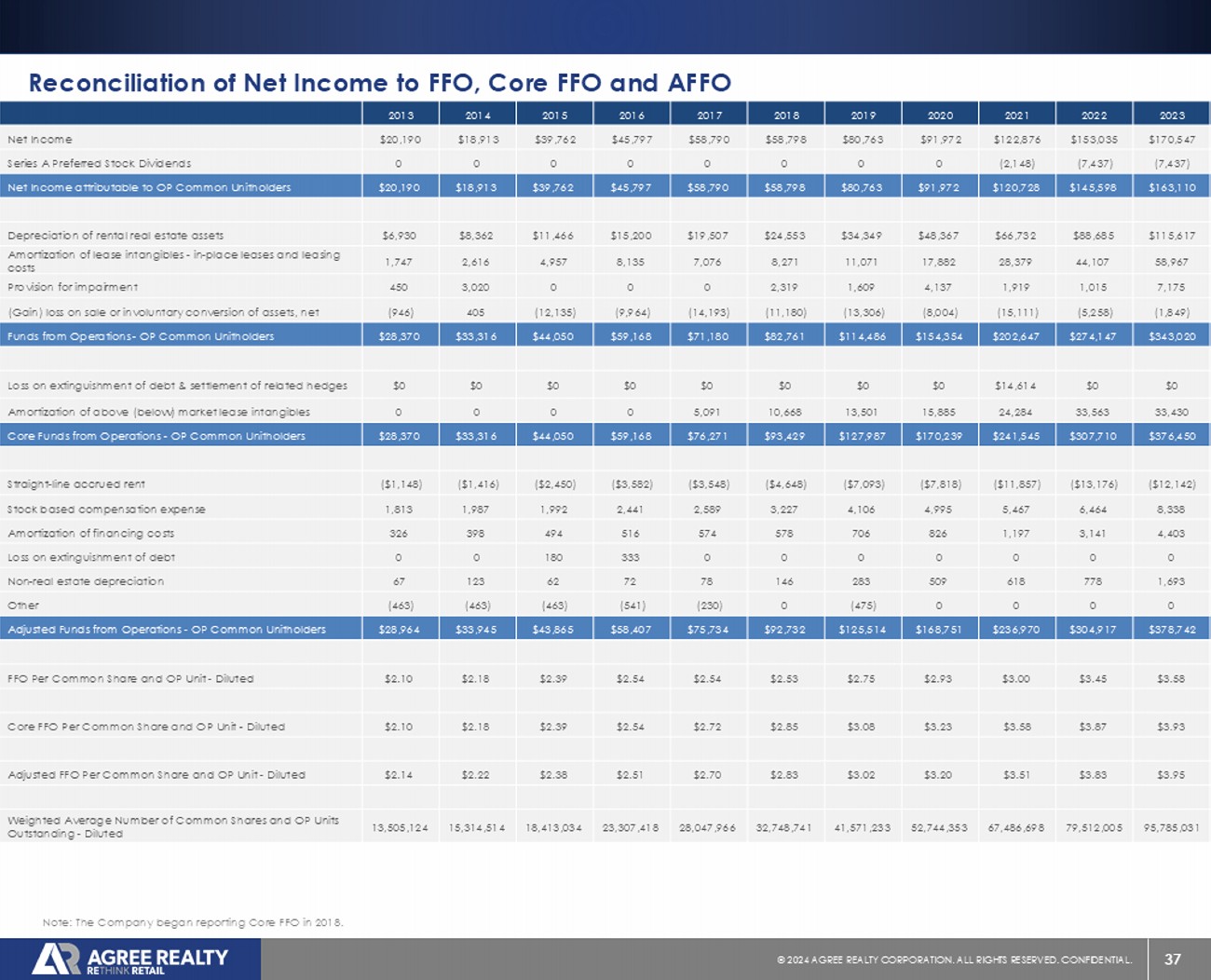 37 © 20 24 AGREE REALTY CORPORATION . ALL RIGHTS RESERVED. CONFIDENTIAL. 2023 2022 2021 2020 2019 2018 2017 2016 2015 2014 2013 $170,547 $153,035 $122,876 $91,972 $80,763 $58,798 $58,790 $45,797 $39,762 $18,913 $20,190 Net Income (7,437) (7,437) (2,148) 0 0 0 0 0 0 0 0 Series A Preferred Stock Dividends $163,110 $145,598 $120,728 $91,972 $80,763 $58,798 $58,790 $45,797 $39,762 $18,913 $20,190 Net Income attributable to OP Common Unitholders $115,617 $88,685 $66,732 $48,367 $34,349 $24,553 $19,507 $15,200 $11,466 $8,362 $6,930 Depreciation of rental real estate assets 58,967 44,107 28,379 17,882 11,071 8,271 7,076 8,135 4,957 2,616 1,747 Amortization of lease intangibles - in - place leases and leasing costs 7,175 1,015 1,919 4,137 1,609 2,319 0 0 0 3,020 450 Provision for impairment (1,849) (5,258) (15,111) (8,004) (13,306) (11,180) (14,193) (9,964) (12,135) 405 (946) (Gain) loss on sale or involuntary conversion of assets, net $343,020 $274,147 $202,647 $154,354 $114,486 $82,761 $71,180 $59,168 $44,050 $33,316 $28,370 Funds from Operations - OP Common Unitholders $0 $0 $14,614 $0 $0 $0 $0 $0 $0 $0 $0 Loss on extinguishment of debt & settlement of related hedges 33,430 33,563 24,284 15,885 13,501 10,668 5,091 0 0 0 0 Amortization of above (below) market lease intangibles $376,450 $307,710 $241,545 $170,239 $127,987 $93,429 $76,271 $59,168 $44,050 $33,316 $28,370 Core Funds from Operations - OP Common Unitholders ($12,142) ($13,176) ($11,857) ($7,818) ($7,093) ($4,648) ($3,548) ($3,582) ($2,450) ($1,416) ($1,148) Straight - line accrued rent 8,338 6,464 5,467 4,995 4,106 3,227 2,589 2,441 1,992 1,987 1,813 Stock based compensation expense 4,403 3,141 1,197 826 706 578 574 516 494 398 326 Amortization of financing costs 0 0 0 0 0 0 0 333 180 0 0 Loss on extinguishment of debt 1,693 778 618 509 283 146 78 72 62 123 67 Non - real estate depreciation 0 0 0 0 (475) 0 (230) (541) (463) (463) (463) Other $378,742 $304,917 $236,970 $168,751 $125,514 $92,732 $75,734 $58,407 $43,865 $33,945 $28,964 Adjusted Funds from Operations - OP Common Unitholders $3.58 $3.45 $3.00 $2.93 $2.75 $2.53 $2.54 $2.54 $2.39 $2.18 $2.10 FFO Per Common Share and OP Unit - Diluted $3.93 $3.87 $3.58 $3.23 $3.08 $2.85 $2.72 $2.54 $2.39 $2.18 $2.10 Core FFO Per Common Share and OP Unit - Diluted $3.95 $3.83 $3.51 $3.20 $3.02 $2.83 $2.70 $2.51 $2.38 $2.22 $2.14 Adjusted FFO Per Common Share and OP Unit - Diluted 95,785,031 79,512,005 67,486,698 52,744,353 41,571,233 32,748,741 28,047,966 23,307,418 18,413,034 15,314,514 13,505,124 Weighted Average Number of Common Shares and OP Units Outstanding - Diluted Reconciliation of Net Income to FFO, Core FFO and AFFO Note: The Company began reporting Core FFO in 2018.