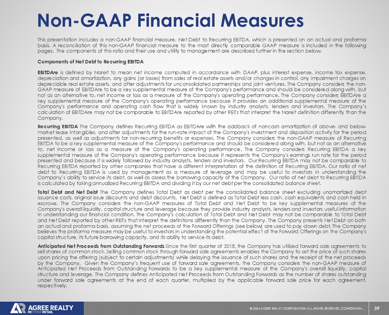 39 © 20 24 AGREE REALTY CORPORATION . ALL RIGHTS RESERVED. CONFIDENTIAL. Non - GAAP Financial Measures This presentation includes a non - GAAP financial measure, Net Debt to Recurring EBITDA, which is presented on an actual and proforma basis . A reconciliation of this non - GAAP financial measure to the most directly comparable GAAP measure is included in the following pages . The components of this ratio and their use and utility to management are described further in the section below . Components of Net Debt to Recurring EBITDA EBITDAre is defined by Nareit to mean net income computed in accordance with GAAP, plus interest expense, income tax expense, depreciation and amortization, any gains (or losses) from sales of real estate assets and/or changes in control, any impairment charges on depreciable real estate assets, and after adjustments for unconsolidated partnerships and joint ventures . The Company considers the non - GAAP measure of EBITDAre to be a key supplemental measure of the Company's performance and should be considered along with, but not as an alternative to, net income or loss as a measure of the Company's operating performance . The Company considers EBITDAre a key supplemental measure of the Company's operating performance because it provides an additional supplemental measure of the Company's performance and operating cash flow that is widely known by industry analysts, lenders and investors . The Company’s calculation of EBITDAre may not be comparable to EBITDAre reported by other REITs that interpret the Nareit definition differently than the Company . Recurring EBITDA The Company defines Recurring EBITDA as EBITDAre with the addback of noncash amortization of above - and below - market lease intangibles, and after adjustments for the run - rate impact of the Company's investment and disposition activity for the period presented, as well as adjustments for non - recurring benefits or expenses . The Company considers the non - GAAP measure of Recurring EBITDA to be a key supplemental measure of the Company's performance and should be considered along with, but not as an alternative to, net income or loss as a measure of the Company's operating performance . The Company considers Recurring EBITDA a key supplemental measure of the Company's operating performance because it represents the Company's earnings run rate for the period presented and because it is widely followed by industry analysts, lenders and investors . Our Recurring EBITDA may not be comparable to Recurring EBITDA reported by other companies that have a different interpretation of the definition of Recurring EBITDA . Our ratio of net debt to Recurring EBITDA is used by management as a measure of leverage and may be useful to investors in understanding the Company’s ability to service its debt, as well as assess the borrowing capacity of the Company . Our ratio of net debt to Recurring EBITDA is calculated by taking annualized Recurring EBITDA and dividing it by our net debt per the consolidated balance sheet . Total Debt and Net Debt The Company defines Total Debt as debt per the consolidated balance sheet excluding unamortized debt issuance costs, original issue discounts and debt discounts . Net Debt is defined as Total Debt less cash, cash equivalents and cash held in escrows . The Company considers the non - GAAP measures of Total Debt and Net Debt to be key supplemental measures of the Company's overall liquidity, capital structure and leverage because they provide industry analysts, lenders and investors useful information in understanding our financial condition . The Company's calculation of Total Debt and Net Debt may not be comparable to Total Debt and Net Debt reported by other REITs that interpret the definitions differently than the Company . The Company presents Net Debt on both an actual and proforma basis, assuming the net proceeds of the Forward Offerings (see below) are used to pay down debt . The Company believes the proforma measure may be useful to investors in understanding the potential effect of the Forward Offerings on the Company's capital structure, its future borrowing capacity, and its ability to service its debt . Anticipated Net Proceeds from Outstanding Forwards Since the first quarter of 2018 , the Company has utilized forward sale agreements to sell shares of common stock . Selling common stock through forward sale agreements enables the Company to set the price of such shares upon pricing the offering (subject to certain adjustments) while delaying the issuance of such shares and the receipt of the net proceeds by the Company . Given the Company’s frequent use of forward sale agreements, the Company considers the non - GAAP measure of Anticipated Net Proceeds from Outstanding Forwards to be a key supplemental measure of the Company's overall liquidity, capital structure and leverage . The Company defines Anticipated Net Proceeds from Outstanding Forwards as the number of shares outstanding under forward sale agreements at the end of each quarter, multiplied by the applicable forward sale price for each agreement, respectively .