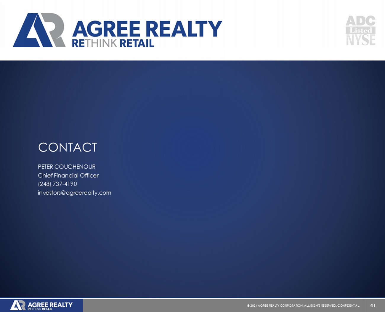41 © 20 24 AGREE REALTY CORPORATION . ALL RIGHTS RESERVED. CONFIDENTIAL. CONTACT PETER COUGHENOUR Chief Financial Officer (248) 737 - 4190 investors@agreerealty.com